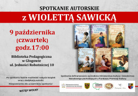Opis wydarzenia: Stowarzyszenie Głogowska Edukacja Kresowa serdecznie zaprasza na spotkanie autorskie z Wiolettą Sawicką. Spotkanie odbędzie się w Bibliotece Pedagogicznej w Głogowie w dniu 09 października 2025 r (czwartek) o godz. 17:00. Wstęp wolny. Wioletta Sawicka to pisarka, twórczyni powieści obyczajowych oraz dziennikarka z wieloletnim doświadczeniem. Urodziła się i mieszka na Warmii, a dokładniej w Olsztynie. Z wykształcenia jest pedagogiem, choć zawodowo zajmuje się przede wszystkim pracą dziennikarską - współpracując z lokalnym radiem, prasą oraz telewizją. Pisze reportaże oraz przeprowadza wywiady z ciekawymi osobowościami. Jest fanką literatury. Kilka lat swojego życia spędziła w Szwecji. Wioletta Sawicka to niewątpliwie jedna z najbardziej rozpoznawalnych polskich autorek literatury obyczajowej. Jej twórczość, szczególnie sagi rodzinne, zdobyły serca tysięcy czytelników w całym kraju. Kiedy mówimy o powieściach Wioletty Sawickiej, nie możemy pominąć jej debiutanckiej sagi, która zapoczątkowała wieloletnią karierę literacką. Wioletta od samego początku swojej kariery wykazywała niezwykłą umiejętność kreowania wielowątkowych historii, które angażują czytelników na długie godziny. Jej styl pisania charakteryzuje się głęboką analizą psychologiczną bohaterów oraz realistycznym portretem polskiej rzeczywistości. Wioletta Sawicka - mistrzyni sag rodzinnych. Powieści Wioletty to przede wszystkim wielotomowe sagi, które śledzą losy kilku pokoleń rodzin. Autorka ma szczególny talent do tworzenia rozbudowanych fabuł, w których każda postać ma swoją wyrazistą osobowość i unikalną historię. Sagi Wioletty Sawickiej są znane z tego, że potrafią wciągnąć czytelnika w świat emocji, dramatów i życiowych wyborów bohaterów. Sawicka w swoich powieściach porusza tematy uniwersalne, które dotykają każdego z nas: miłość, zdrada, rodzinne konflikty, dążenie do szczęścia oraz walka z przeciwnościami losu. To właśnie dzięki tej uniwersalności sagi Wioletty cieszą się tak ogromną popularnością wśród czytelników różnych pokoleń. Spotkanie dofinansowane ze środków Ministerstwa Kultury i Dziedzictwa Narodowego pochodzących z Funduszu Promocji Kultury.