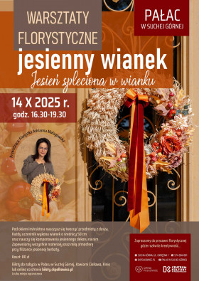 Poczuj magię jesieni i stwórz własną, niepowtarzalną ozdobę! Zapraszamy na warsztaty florystyczne „Jesień spleciona w wianku”, które odbędą się 14 października w Pałacu w Suchej Górnej w godzinach 16.30-19.30.