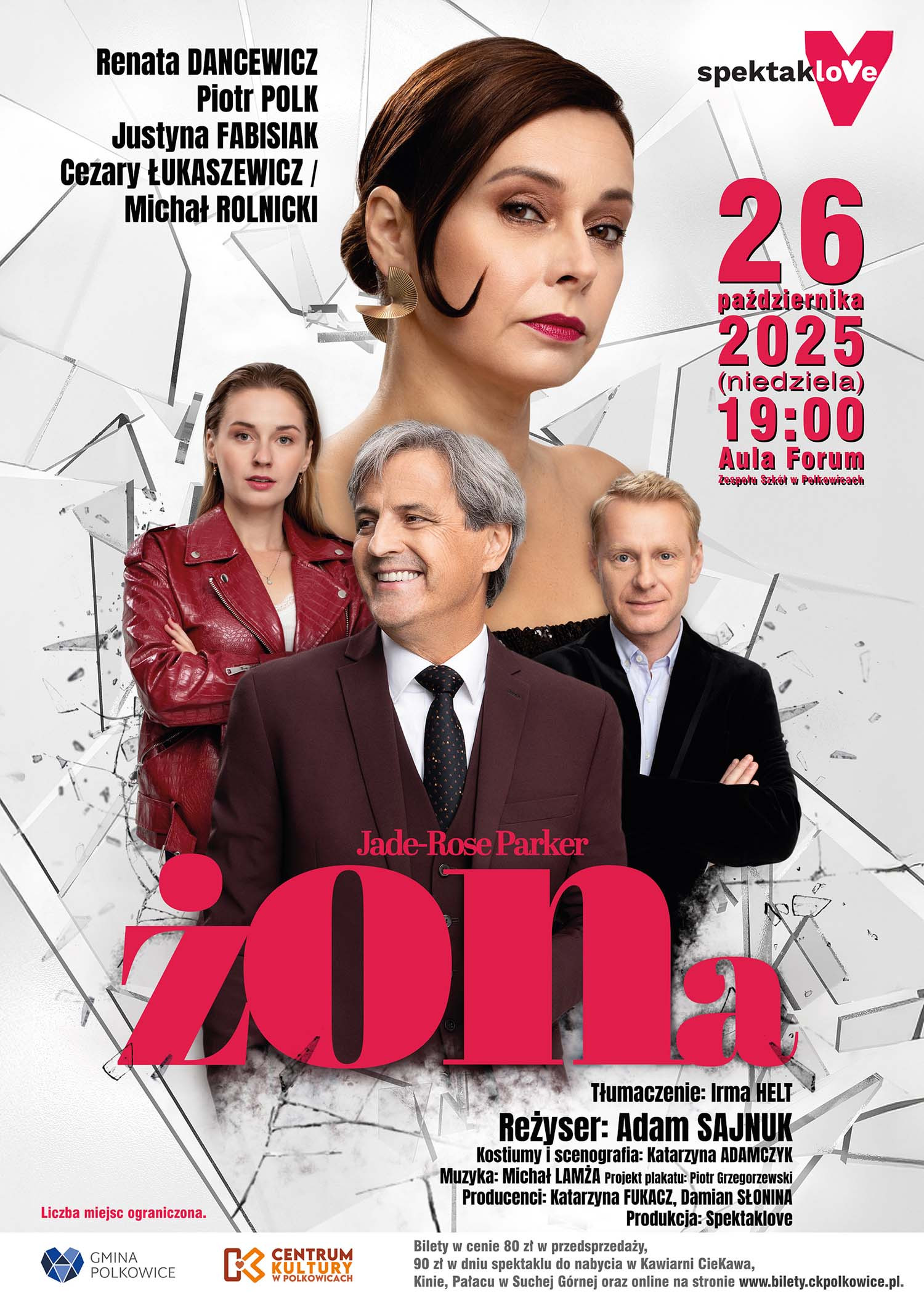 Miejscowość: Polkowice Miejsce: Aula Forum Zespołu Szkół Data rozpoczęcia: 26.10.2025 19:00:00 Data zakończenia: 26.10.2025 20:30:00 Organizator: Centrum Kultury w Polkowicach Opis wydarzenia: Renata Dancewicz, Piotr Polk, Justyna Fabisiak i Cezary Łukaszewicz na scenie w Polkowicach! Już 26 października o godzinie 19:00 w Auli Forum Zespołu Szkół w Polkowicach zobaczymy gwiazdy polskiego kina i teatru w niezwykłym spektaklu „żONa” – polskiej prapremierze sztuki Jade-Rose Parker, która podbiła francuską publiczność. To komedia pełna zwrotów akcji, błyskotliwych dialogów i sytuacji, w których śmiech miesza się z refleksją. "żONa" François startuje w wyborach na mera miasta. Ma liberalne poglądy i wysokoprocentowe poparcie. Jego żona Carla jest inteligentna i atrakcyjna, a piękna córka Louise to ich oczko w głowie. Obrazek idealny - wizerunkowy wzór sukcesu. Ale… życie to nie plakat wyborczy. Jeden dzień wywróci do góry nogami losy całej rodziny, a w konsekwencji może zrujnować błyskotliwą karierę Françoisa. Kiedy ktoś wyjawi z dawna skrywaną tajemnicę, inny ogłosi zaskakującą nowinę, a we wszystko wmiesza się główny oponent polityczny Rachon, życie Françoisa zadrży w posadach. Rozpocznie się “festiwal” kłótni, oskarżeń i kolejnych “rewelacji”. Sztuka francuskiej autorki śmieszy do łez, ale też skłania do dyskusji. Reżyser Adam Sajnuk umiejętnie wydobywa ironię losu polityka wystawionego na próbę, a czwórka znakomitych aktorów gra brawurowo i improwizuje, kreując wiarygodne postaci tej komedii o hipokryzji miłości i tolerancji. Autor: Jade-Rose Parker Tłumaczenie: Irma Helt Reżyser: Adam Sajnuk Kostiumy i scenografia: Katarzyna Adamczyk Muzyka: Michał Lamża Producenci: Katarzyna Fukacz, Damian Słonina Produkcja: Tito Productions Spektaklove Obsada: Renata Dancewicz Piotr Polk Justyna Fabisiak Cezary Łukaszewicz Bilety Bilety w cenie 80 zł w przedsprzedaży, 90 zł w dniu spektaklu do nabycia w Kawiarni CieKawa, Kinie, Pałacu w Suchej Górnej oraz online na stronie www.bilety.ckpolkowice.pl. Liczba miejsc ograniczona. |
