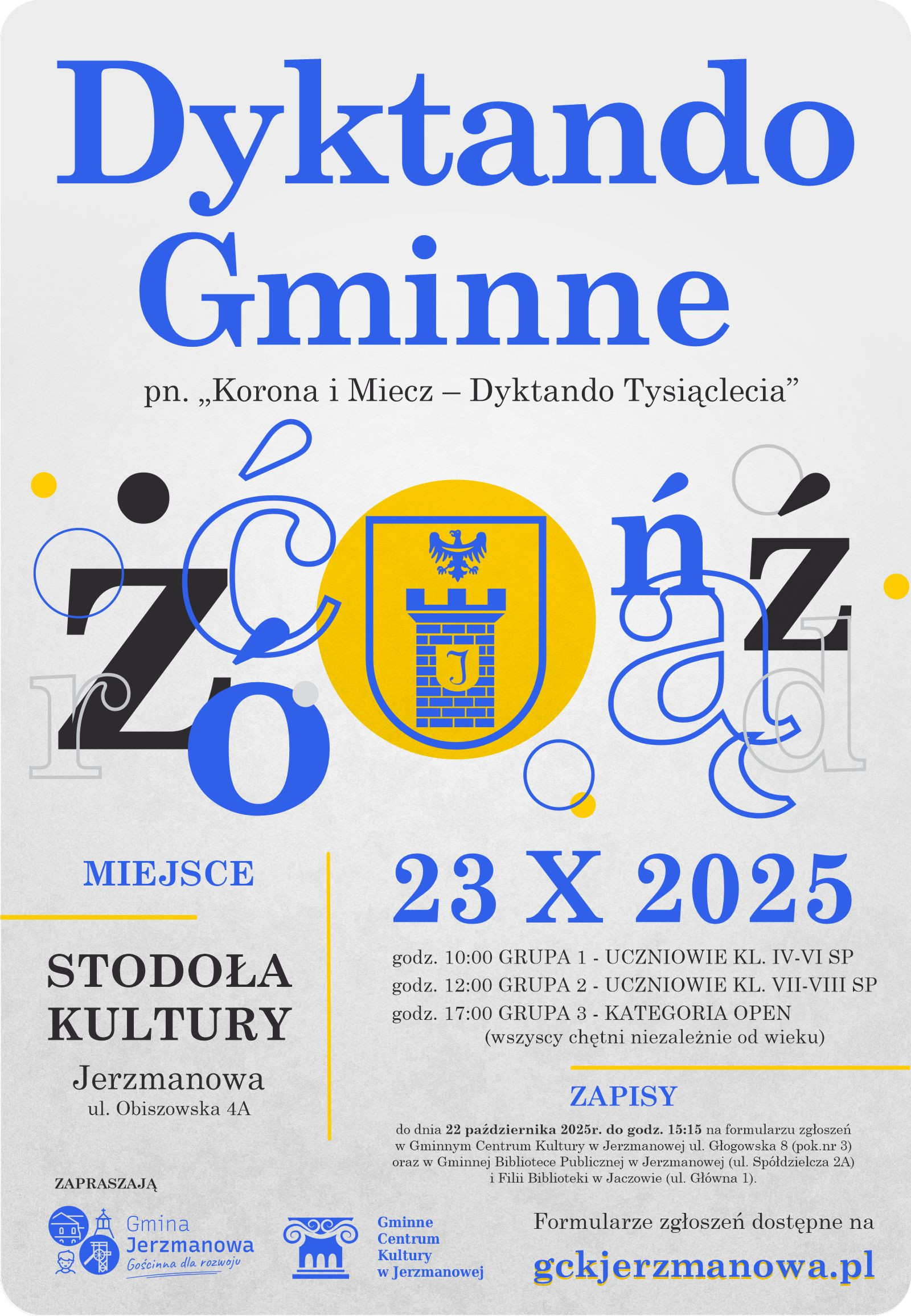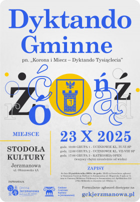 Miejscowość: Jerzmanowa Miejsce: Stodoła Kultury Data rozpoczęcia: 23.10.2025 10:00:00 Data zakończenia: 23.10.2025 18:00:00 Organizator: Gminne Centrum Kultury w Jerzmanowej Opis wydarzenia: Miłośnicy języka polskiego, oto wyzwanie, na które czekaliście! W tym roku przypada niezwykła rocznica koronacji Bolesława Chrobrego – wydarzenia, które – obok Chrztu Polski – na zawsze odmieniło dzieje naszego państwa. Z tej okazji zapraszamy wszystkich mieszkańców gminy Jerzmanowa, a także osoby spoza regionu, na Dyktando Gminne pn. „Korona i Miecz – Dyktando Tysiąclecia”, które pozwoli w duchu zabawy i rywalizacji uczcić to wyjątkowe wydarzenie! Jak co roku Dyktando odbędzie się w trzech kategoriach: Kategoria I, godz. 10:00 - uczniowie kl. IV-VI Kategoria II, godz. 12:00 - uczniowie kl. VII-VIII Kategoria III, godz. 17:00 - kategoria Open (wszyscy chętni, niezależnie od wieku i tego, czy wzięli udział w dyktandzie w innych grupach) ZAPISY! Do dnia 22 października 2025r. do godz. 15:15 na formularzu zgłoszeń (do pobrania poniżej) w Gminnym Centrum Kultury w Jerzmanowej ul. Głogowska 8 (pok.nr 3) oraz w Gminnej Bibliotece Publicznej w Jerzmanowej (ul. Spółdzielcza 2A) i Filii biblioteki w Jaczowie (ul. Główna 1). TERMIN: 23.10.2025r. MIEJSCE: Jerzmanowa - Stodoła Kultury RYWALIZACJA SZKOLNA W dniach 27.10.2024r. – 30.10.2024r. w Szkole Podstawowej im. Jana Pawła II w Jerzmanowej oraz w Szkole Podstawowej im. Henryka Sienkiewicza w Jaczowie odbędą się osobno dyktanda klasowe w kategoriach. - Grupa IV – klasy IV-VI - Grupa V – klasy VII-VIII Na uczestników czekają nie tylko zaszczytne tytuły, statuetki i dyplomy lecz także atrakcyjne NAGRODY: W kategorii I i II - uczniów szkół podstawowych 400, 350 i 250 zł z pierwsze, drugie i trzecie miejsce. W kategorii OPEN za miejsca na podium zwycięzcy otrzymają 800, 600 i 500 zł. Ogłoszenie wyników i wręczenie nagród odbędzie się dnia 11 listopada 2025r. podczas obchodów Święta Niepodległości i XIV Biegu Gęsi w Jerzmanowej na scenie głównej. Szczegóły, regulamin i karty zgłoszeń na gckjerzmanowa.pl |