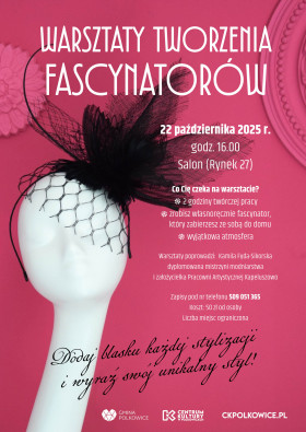 Zapraszamy młodzież i dorosłych na warsztaty, podczas których stworzysz jedyne w swoim rodzaju fantazyjne nakrycie głowy, czyli fascynator! Zajęcia odbędą się 22 października 2025 roku o godzinie 16.00 w Salonie (Polkowice, ul. Rynek 27).