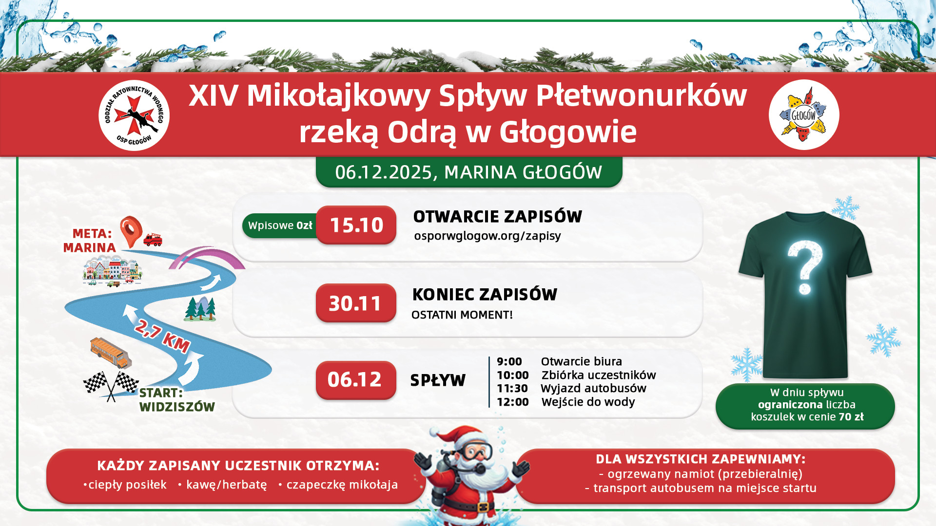 Opis wydarzenia: Ochotnicza Straż Pożarna Oddział Ratownictwa Wodnego w Głogowie ma przyjemność zaprosić na XIV Mikołajkowy Spływ Płetwonurków rzeką Odrą w Głogowie, który odbędzie się 6 grudnia 2025 r.