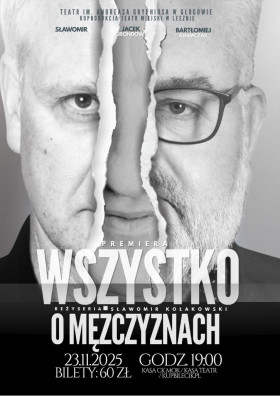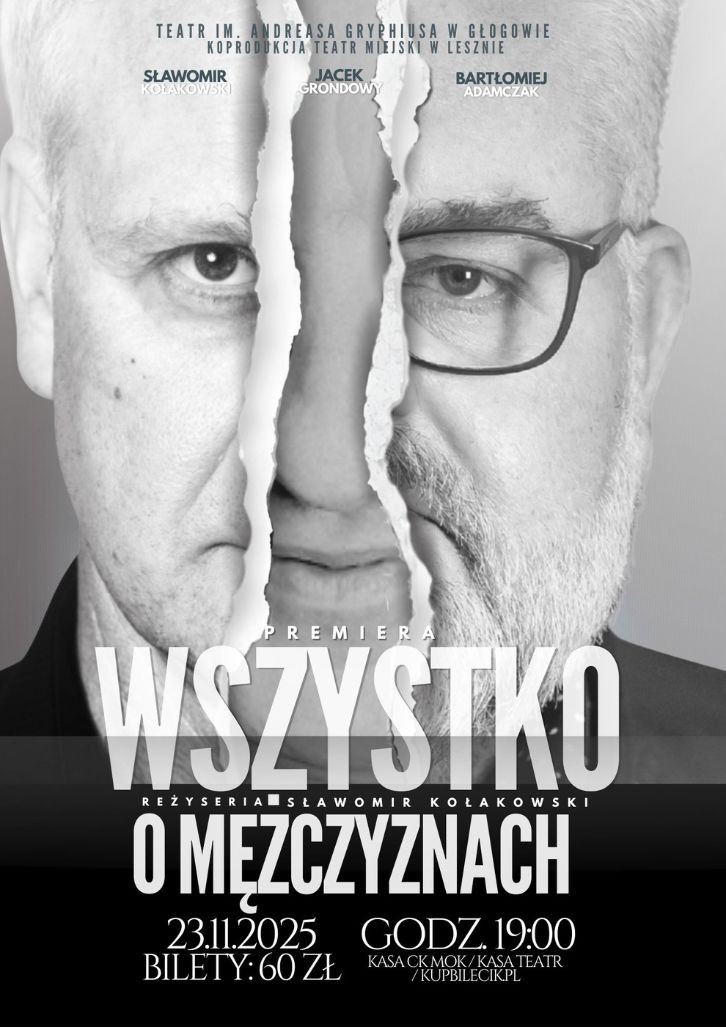 Miejscowość: Głogów Miejsce: Teatr im. Andreasa Gryphiusa, Rynek 8 Data rozpoczęcia: 23.11.2025 19:00:00 Data zakończenia: 23.11.2025 20:00:00 Organizator: Centrum Kultury Opis wydarzenia: „WSZYSTKO O MĘŻCZYZNACH" GŁOGOWSKA SCENA KULTURY 23.11.2025 r. GODZ. 19:00 Bilety: 60 zł Bilety dostępne w kasie Teatru - godzinę przed spektaklem (tel. 783 403 503), kasie CK oraz na kupbilecik.pl