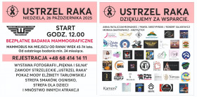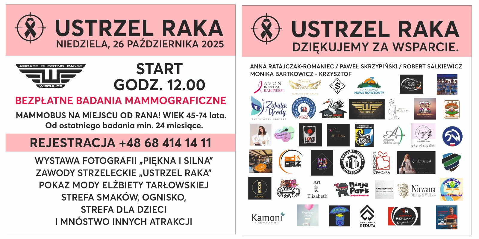 | Miejscowość: Wiechlice Miejsce: Strzelnica Data rozpoczęcia: 26.10.2025 12:00:00 Data zakończenia: 26.10.2025 18:00:00 Organizator: Ewelina Wawrzyńczyk Opis wydarzenia: PLAN WYDARZENIA – Ustrzel Raka 26 października 2025 (niedziela) Strzelnica Wiechlice – Airbase Shooting Range Start: godz. 12:00 Od rana – Mammobus na miejscu! Od samego rana na terenie wydarzenia będzie dostępny mammobus, w którym Panie będą mogły skorzystać z bezpłatnych badań mammograficznych. Bardzo prosimy o wcześniejszą rejestrację: +48 68 414 14 11 Wiek: 45–74 lata Od ostatniej mammografii musi minąć minimum 24 miesiące (chyba że lekarz zalecił wcześniej). Każda zarejestrowana uczestniczka badania weźmie udział w losowaniu nagród i voucherów! Kochane Panie – zadbajcie o siebie. Profilaktyka to najlepsza broń w walce z rakiem! 12:00 Parada Motocykli Motocykliści Okręg Nowosolski (jeśli pogoda pozwoli) Po paradzie – oficjalne rozpoczęcie wydarzenia i przywitanie gości. Emilia Gajda-Idziak przedstawi bohaterki projektu Piękna i Silna– niezwykłe kobiety, które z odwagą i uśmiechem pokazują, że można wygrać z chorobą i odzyskać radość życia. 13:00 – 13:30 ZUMBA ULTRA GYM Nowa Sól Energia, taniec, endorfiny i uśmiech – połączmy ruch z pomocą! 13:30 – 14:00 Prelekcja Aneta Szpak-Korycka Temat: „Pielęgnacja skóry w trakcie terapii onkologicznej” 14:00 Pokaz sukien projektu Elżbiety Elżbieta Tarłowska – pełen koloru, emocji, piękna i kobiecości. Od godz. 14:00 – możliwość spróbowania treningu EMS pod czujnym okiem Aleksandry Aleksandra Suczylkin Pokaz makijażu – profesjonalne poradyod Agata Trojanowska , która pokaże, jak wydobyć piękno, siłę i pewność siebie każdej kobiety. 13:00 – 16:00 Zawody strzeleckie „Ustrzel Raka” symboliczna rywalizacja pełna pasji, siły i pozytywnej energii! Wystawa przez cały czas trwania wydarzenia Piękna i Silna – wystawa fotografii Emilii Gajdy-Idzik Projekt pokazujący moc, piękno i odwagę kobiet po chorobie. Sponsorem wystawy jest Fabryka Reklamy Lukasz Glonek , która przygotowała wyjątkową oprawę tej ekspozycji. 15:00 Występ zespołu NowoMiasteczkowi Młodzi, utalentowani artyści z ogromnym sercem i pasją do pomagania. Po występie zespołu Wręczenie nagród dla najlepszych strzelców Uhonorujemy najlepszych uczestników zawodów strzeleckich – bo każda celność to symbol czujności i odwagi! Około 16:30 Koncert końcowy Monika Bartkowicz-Krzysztof wraz z zespołem Muzyka pełna emocji, pasji i wzruszeń – wyjątkowe zakończenie dnia pełnego dobra. Oprawa muzyczna przez cały dzień O energię, rytm i świetną atmosferę zadba niezawodny Przemek Paszko – muzyka, która doda mocy i uśmiechu przez cały dzień! Ścianka do zdjęć przygotowana przez Magiczny balon Kamoni - Bielizna Dla Ciebie Strefa Smaków, Ognisko i Strefa Dzieci Anna Ratajczak-Romaniec Przez cały czas trwania wydarzenia: ciepłe posiłki, domowe wypieki i regionalne specjały, stoiska z jedzeniem i napojami, ognisko, przy którym będzie można się ogrzać, porozmawiać i spędzić czas w przyjaznej atmosferze, dla najmłodszych – dmuchańce i kącik zabaw (jeśli pogoda pozwoli), które zapewnią radość i uśmiech dzieciom przez cały dzień! Fundacja "Fajna Ferajna" Koło Gospodyń Wiejskich Krzywczyce Koło Gospodyń Wiejskich w Bukowicy Smacznie I Domowo Paweł Skrzypiński Specjalni goście i atrakcje dodatkowe Jurajska Grupa Militarna – swoją obecnością zaszczyci nas ta wyjątkowa społeczność pasjonatów militarii. Zakład Karny w Krzywańcu ,Zarząd Terenowy Krzywaniec WCR Żagań Konsultantka Avon Re Grz i wiele innych atrakcji, które będą dostępne przez cały dzień! Zbiórka charytatywna przez cały dzień Podczas wydarzenia „Ustrzel Raka” wszystkie środki będziemy zbierać do puszek, które przygotuje i poprowadzi z nami Nowosolska Paczka Za wszystko będziemy płacić do puszki – za posiłki, napoje, udział w atrakcjach i inne aktywności. Każda złotówka trafi do Stowarzyszenia Stowarzyszenie Centruś przy Centrum Zdrowia Dziecka w Warszawie Każdy gest, nawet najmniejszy, ma ogromne znaczenie – razem możemy naprawdę wiele! |