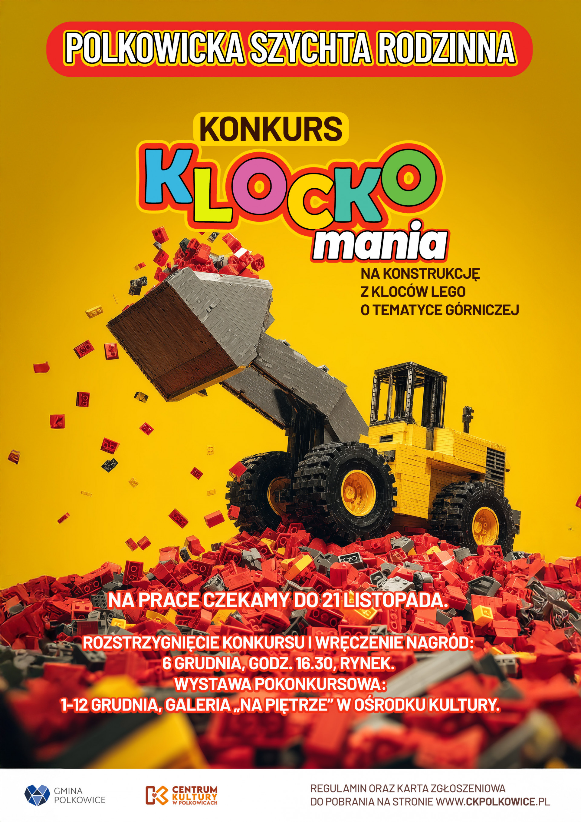 KLOCKOmania rokrocznie organizowana jest w ramach obchodów barbórkowych, które w tym roku odbywają się pod hasłem "Polkowicka szychta rodzinna". Zadaniem uczestników jest samodzielne wykonanie konstrukcji przestrzennej z klocków LEGO o tematyce górniczej (np. strój górniczy, maszyny górnicze, praca górnika). Kluczowym warunkiem jest, aby każda praca była absolutnie oryginalna - nie można korzystać z gotowych zestawów LEGO. Wymiary konstrukcji muszą mieć: minimum 15x15x5 cm, maksimum 40x40x100 cm