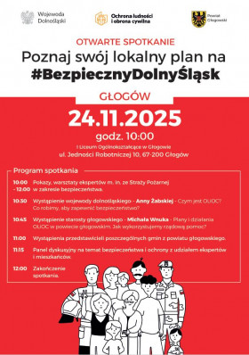 Podczas wydarzenia wojewoda Anna Żabska przedstawi założenia programu Ochrona Ludności i Obrona Cywilna (OLiOC), a starosta Michał Wnuk omówi lokalne działania i plany w zakresie bezpieczeństwa w powiecie głogowskim.