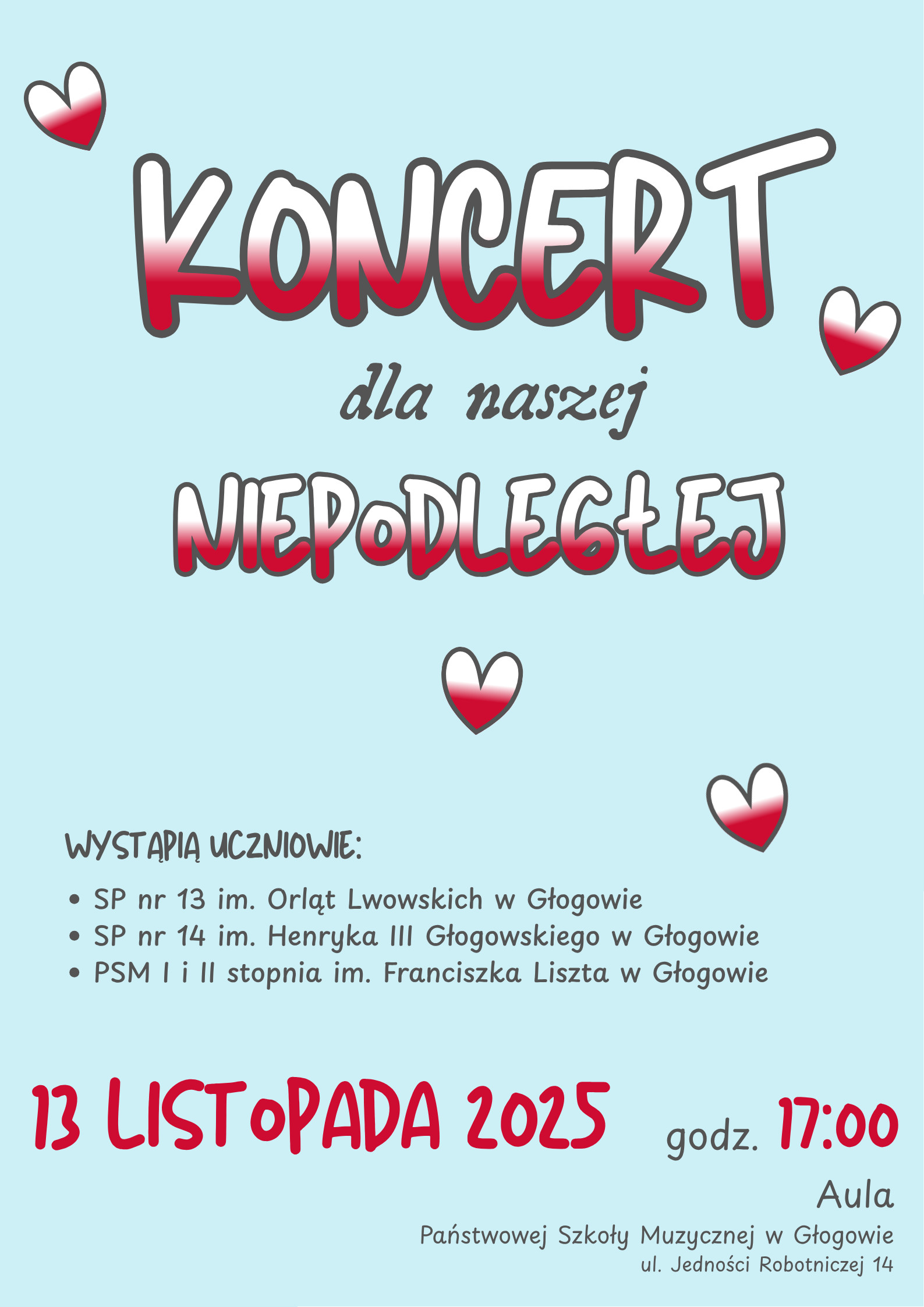 | Miejscowość: Głogów Miejsce: Aula Państwowej Szkoły Muzycznej w Głogowie Data rozpoczęcia: 13.11.2025 17:00:00 Data zakończenia: 13.11.2025 18:00:00 Organizator: Państwowa Szkoła Muzyczna I i II stopnia im. Franciszka Liszta w Głogowie Opis wydarzenia: 13 listopada 2025 r. godz. 17:00 Aula Państwowej Szkoły Muzycznej w Głogowie Wstęp wolny Zapraszamy na wyjątkowy koncert, który przygotowany został we współpracy z dwoma głogowskimi szkołami podstawowymi. Młodzi głogowianie wspólnie przeżywać będą radość i dumę z Niepodległej Ojczyzny. Na koncercie zaprezentują się uczniowie: - Szkoły Podstawowej nr 13 im. Orląt Lwowskich, - Szkoły Podstawowej nr 14 im. Henryka III Głogowskiego, - Państwowej Szkoły Muzycznej I i II stopnia im. Franciszka Liszta. Podczas koncertu usłyszymy utwory muzyczne i poetyckie o charakterze patriotycznym oraz inspirowane polską tradycją i kulturą. Zapraszamy do wspólnego muzycznego świętowania niepodległości! |