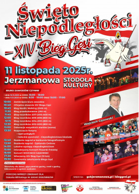 | Miejscowość: Jerzmanowa Miejsce: Stodoła Kultury Data rozpoczęcia: 11.11.2025 10:00:00 Data zakończenia: 11.11.2025 20:00:00 Organizator: Gminne Centrum Kultury w Jerzmanowej, Gmina Jerzmanowa, Sport Górski Opis wydarzenia: 11 LISTOPADA 2025 ŚWIĘTUJ I BIEGAJ Z NAMI PODCZAS ŚWIĘTA NIEPODLEGŁOŚCI POŁĄCZONEGO Z XIV EDYCJĄ BIEGU GĘSI! Bieg Gęsi połączony z obchodami Święta Niepodległości w gminie Jerzmanowa to tradycja, pełna wrażeń i gościnności. Zapoczątkowane w 2012 roku wydarzenie z roku na rok wzbudza coraz większe zainteresowanie i przyciąga coraz większą liczbę uczestników. Obecnie w biegach na 7-miu dystansach rokrocznie bierze udział ponad 500 zawodników, w tym dzieci, młodzież, osoby dorosłe i seniorzy. Wisienką na torcie sportowej rywalizacja jest Wieczorny Bieg Główny dla kategorii 16+, gdzie niepowtarzalny klimat tworzą kibice i trzymane przez nich pochodnie oświetlające trasę biegów, zawodnicy używający patriotycznych symboli oraz prowadzący imprezę 2 – krotny Mistrz - Iron Men Jerzy Górski. Triumfatorzy Biegu otrzymują pieczone gęsi, w biało-czerwonych barwach, unikatowe medale i nagrody rzeczowe. Jednak całość imprezy to nie tylko sportowe emocje, to duch walki i wola zwycięstwa symbolizujące walkę o niepodległość. To eksponowanie przez sołectwa i koła gospodyń wiejskich staropolskiej kuchni celebrującej gęsinę i rogale marcińskie. To podtrzymywanie kulturowych tradycji poprzez śpiewanie pieśni patriotycznych, integrację i udział w koncertach. Szczegóły dotyczące biegów i listy startowe na stronie Biegu Gęsi: bieggesi.pl W programie Interaktywny Koncert Piosenki Polskiej - angażujące publiczność wydarzenie muzyczne oraz konkursy z nagrodami, prowadzone przez Karolinę Zygner i Arkadiusza Kaczmarka. Gwiazdą wieczoru będzie Wojciech Gąsowski z koncertem pełnych największych przebojów z jego muzycznego repertuaru. TERMIN: 11 listopada 2025 (wtorek) MIEJSCE: Jerzmanowa - Stodoła Kultury w Jerzmanowej RAMOWY PROGRAM IMPREZY: 10:00 Zamknięcie Biura Zawodów 10:30 Oficjalne otwarcie XIV Biegu Gęsi 10:45 Bieg Nordic Walking 250 m 11:30 Bieg przedszkolaków na dystansie (250 m) 11:45 Bieg roczników: 2017-2018 na dystansie (400 m - 1 okrążenie) 12:00 Bieg roczników 2015-2016 (800 m - 1 okrążenie) 12:15 Bieg roczników 2014-2013 (800 m - 1 okrążenie) 12:30 Bieg roczników 2012-2010 (800 m - 1 okrążenie) 13:00 Dekoracja wszystkich startów (scena) 13:30 Rozpoczęcie festynu - Apel Poległych - Sołeckie pyszności - niepodległościowa biesiada 13:40 Rozdanie nagród w konkursie fotograficznym 13:50 Rozdanie nagród - Dyktando Gminne 14:00 Lokalne występy niepodległościowe 15:00 Interaktywny Koncert Piosenki Polskiej 16:00 Gwiazda wieczoru - Wojciech Gąsowski 17:30 Wieczorny - XIV Bieg Gęsi na dystansie 10 km 19:30 Ceremonia zakończenia Biegu Gęsi Przyjdź i wesprzyj akcję! Podczas imprezy zbieramy dla Oskarka Bilińskiego - Nr zbiórki 2025/2895/OR prowadzonej przez: Głogowskie Stowarzyszenie "Otwarte Drzwi" ATRAKCJE TOWARZYSZĄCE: - animacje i warsztaty niepodległościowe dla dzieci - kibicowanie z ogniem wolności - ŚNIADANIE NIEPODLEGŁOŚCIOWE (dla zawodników biegów szkolnych i Nordic Walking: Rogal Marciński + kakao) - NIEPODLEGŁOŚCIOWA BIESIADA - gęsina na stoiskach KGW (za datek do puszki) - NIEPODLEGŁOŚCIOWA KOLACJA - STRAŻACKA KUCHNIA I GIGA PATELNIA Z GĘSINĄ Na wspólne przeżywanie Święta Niepodległości zapraszają: Gminne Centrum Kultury w Jerzmanowej Gmina Jerzmanowa Sport Górski - Jerzy Górski Sołectwa i KGW Gminy Jerzmanowa Jednostki OSP Gminy Jerzmanowa 125 Jaczowska Drużyna Harcerzy HUSARIA ZAPRASZAMY DO JERZMANOWEJ ! |