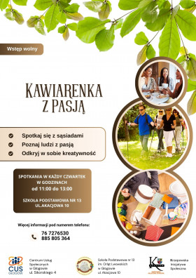 | Miejscowość: Głogów Miejsce: Szkoła Podstawowa nr 13 im. Orląt Lwowskich w Głogowie Data rozpoczęcia: 27.11.2025 11:00:00 Data zakończenia: 27.11.2025 13:00:00 Organizator: Centrum Usług Społecznych w Głogowie Opis wydarzenia: Centrum Usług Społecznych w Głogowie serdecznie zaprasza na cotygodniowe spotkania w formie warsztatów, zajęć i wydarzeń tematycznych. Kawiarenka z Pasją to nowa forma wsparcia społeczności lokalnej skierowanej do mieszkańców Głogowa w szczególności osiedla Nosocice, Krzepów oraz Widziszów. Jeśli chcecie twórczo spędzić czas, poznać inspirujących ludzi i odkryć nowe pasje w przyjaznej atmosferze, koniecznie dołączcie do Kawiarenki z Pasją. Podczas spotkania czekają na Was: • kreatywne warsztaty • swobodna przestrzeń do rozmów i wymiany doświadczeń • filiżanka dobrej kawy i miła atmosfera • możliwość spróbowania swoich sił w nowych, rozwijających aktywnościach Spotkania mają charakter otwarty – cotygodniowy. Pierwsze spotkanie odbędzie się 27.11.2025r. w godz. 11:00-13:00 w budynku Szkoły Podstawowej nr 13 w Głogowie. Przyjdź zainspiruj się i spędź czas w gronie osób, które lubią robić coś z pasją! Serdecznie zapraszamy! |