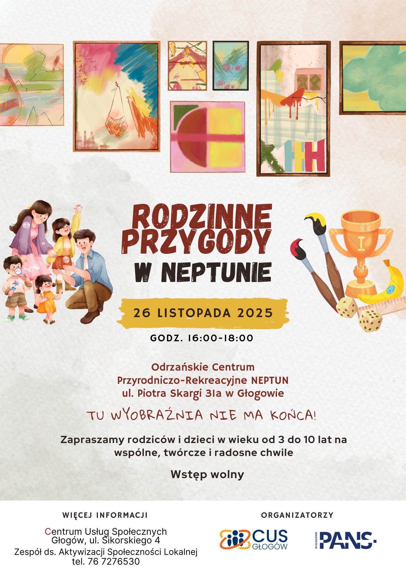 | Miejscowość: Głogów Miejsce: Centrum Przyrodniczo-Rekreacyjne NEPTUN, ul. Piotra Skargi 31a Data rozpoczęcia: 26.11.2025 16:00:00 Data zakończenia: 26.11.2025 18:00:00 Organizator: Centrum Usług Społecznych w Głogowie Opis wydarzenia: Centrum Usług Społecznych w Głogowie serdecznie zaprasza wszystkie rodziny z dziećmi w wieku od 3 do 10 lat na wyjątkowe spotkania pełne zabawy, wspólnego działania i pozytywnej energii! To doskonała okazja, aby: - tworzyć, bawić się, eksperymentować, - poznawać proste sposoby budowania dobrych relacji w rodzinie, - uczyć się jak wspólna zabawa i rozmowy wzmacniają więzi i poczucie bezpieczeństwa, - po prostu cieszyć się sobą. Czekają na was animacje, ruch, wspólne gry oraz twórcze działania, które umacniają więzi rodzinne i wprowadzają dużo uśmiechu. Zapraszamy na spotkania w dniach 26.22.2025r., 04.12.2025r. oraz 10.12.2025r. od godz. 16:00 do 18:00. Wstęp wolny. Dołączcie do nas i sprawdźcie, jak wiele radości może przynieść wspólne spędzony czas w Neptunie! Szczegóły pod numerem: tel. 76 7276530 kom. 885 805 352 |
