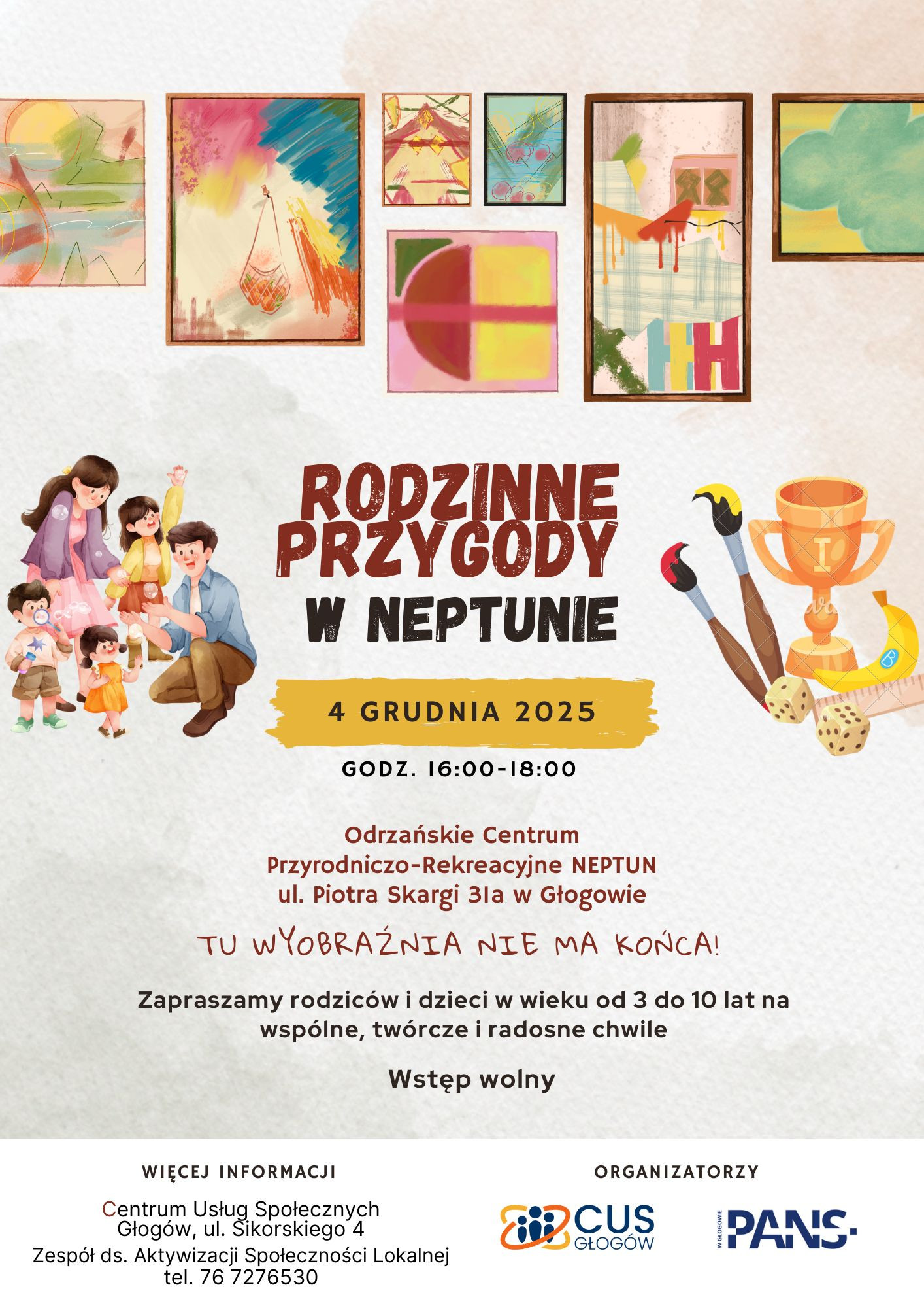 | Miejscowość: Głogów Miejsce: Centrum Przyrodniczo-Rekreacyjne NEPTUN, ul. Piotra Skargi 31a Data rozpoczęcia: 04.12.2025 16:00:00 Data zakończenia: 04.12.2025 18:00:00 Organizator: Centrum Usług Społecznych Opis wydarzenia: Centrum Usług Społecznych w Głogowie serdecznie zaprasza wszystkie rodziny z dziećmi w wieku od 3 do 10 lat na wyjątkowe spotkanie pełne zabawy, wspólnego działania i pozytywnej energii! To doskonała okazja, aby: - tworzyć, bawić się, eksperymentować, - poznawać proste sposoby budowania dobrych relacji w rodzinie, - uczyć się jak wspólna zabawa i rozmowy wzmacniają więzi i poczucie bezpieczeństwa, - po prostu cieszyć się sobą. Czekają na was animacje, ruch, wspólne gry oraz twórcze działania, które umacniają więzi rodzinne i wprowadzają dużo uśmiechu. Zapraszamy na spotkania w dniach 04.12.2025r. oraz 10.12.2025r. w godzinach od 16:00 do 18:00. Wstęp wolny. Dołączcie do nas i sprawdźcie, jak wiele radości może przynieść wspólnie spędzony czas w Neptunie! Szczegóły pod numerem: tel. 76 7276530 kom. 885805352 |