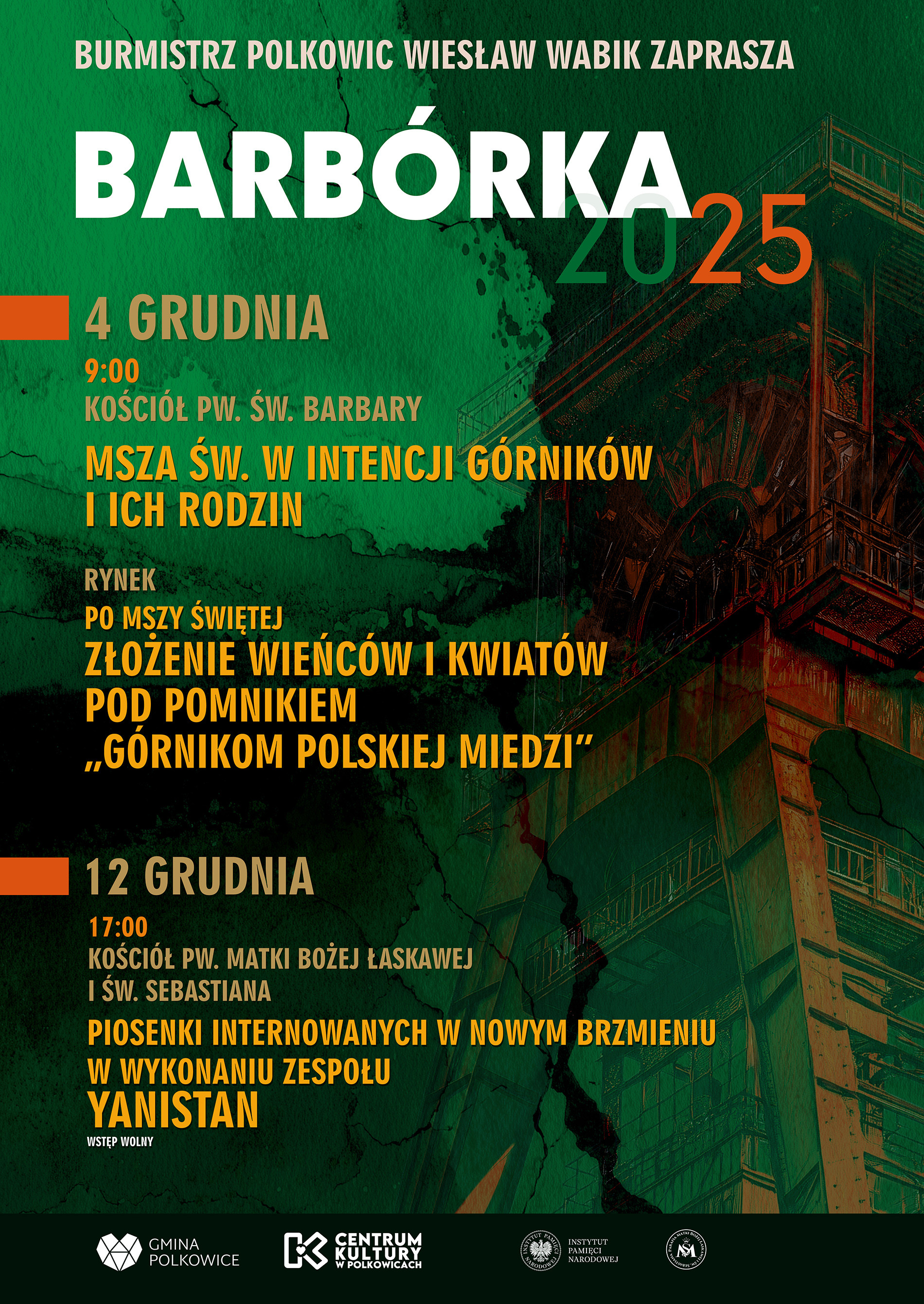 Obchody Barbórki w Polkowicach rozpoczniemy 4 grudnia o godz. 09.00 uroczystą Mszą Świętą w kościele pw. św. Barbary, patronki górników. Po mszy zapraszamy na tradycyjne złożenie wieńców i kwiatów pod pomnikiem "Górnikom Polskiej Miedzi".