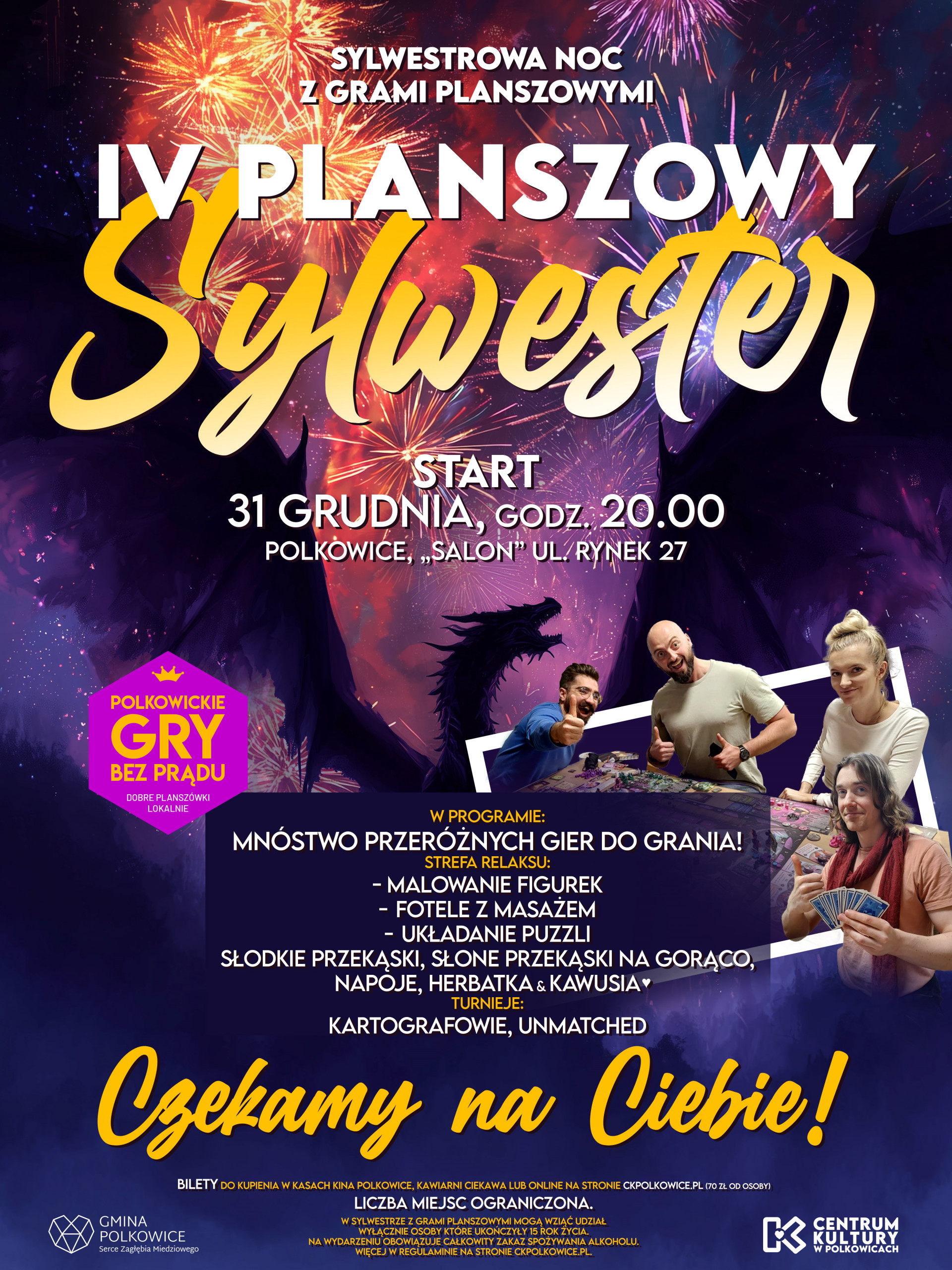 | Miejscowość: Polkowice Miejsce: Salon Polkowicki, Rynek 27 Data rozpoczęcia: 31.12.2025 20:00:00 Data zakończenia: 31.12.2025 00:00:00 Organizator: Centrum Kultury w Polkowicach Opis wydarzenia: IV Planszowy Sylwester – Zagraj w Nowy Rok! Wskakuj do „Salonu”! Planszówki, świetna ekipa i masa dobrej zabawy – tak właśnie będziemy żegnać 2025 rok i witać 2026! Co dla Ciebie przygotowaliśmy? Górę planszówek – od klasyków po zupełne nowości od Rebel, Phalanx, Portal, Lucky Duck i IUVI Games, Ogry games, Galakta i innych. Każdy znajdzie coś dla siebie. Strefę relaksu – kiedy potrzebujesz złapać oddech: - Malowanie figurek dla tych, którzy lubią coś stworzyć własnymi rękami, - Układanie puzzli, żeby wejść w nowy rok na spokojnie. IV Turniej Kartografów – sprawdź, czy to Ty zostaniesz tegorocznym mistrzem map! II Turniej Unmatched – epickie starcia bohaterów, legend i baśni. Szykuj się na emocje! Mega przyjazna atmosfera – u nas każdy czuje się jak wśród znajomych. Przekąski i napoje – bo gra na pusty żołądek to nie gra. Kiedy gramy? 31 grudnia 2025, start o 20:00 Gdzie? „Salon”, Rynek 27, Polkowice 59-101 Bilety w cenie 70 zł od osoby do zakupu w Kawiarni CieKawa, Kinie oraz online na www.bilety.ckpolkowice.pl/MSI Miejscówki szybko znikają, więc łap swoje, zanim ktoś Cię ubiegnie! Dołącz do nas i wejdź w 2026 rok z kostkami w dłoni, uśmiechem na twarzy i dobrą ekipą przy stole. Wejścia dla osób poniżej 18 roku życia tylko za zgodą lub opieką opiekuna prawnego. Na wydarzeniu obowiązuje całkowity zakaz spożywania alkoholu. |