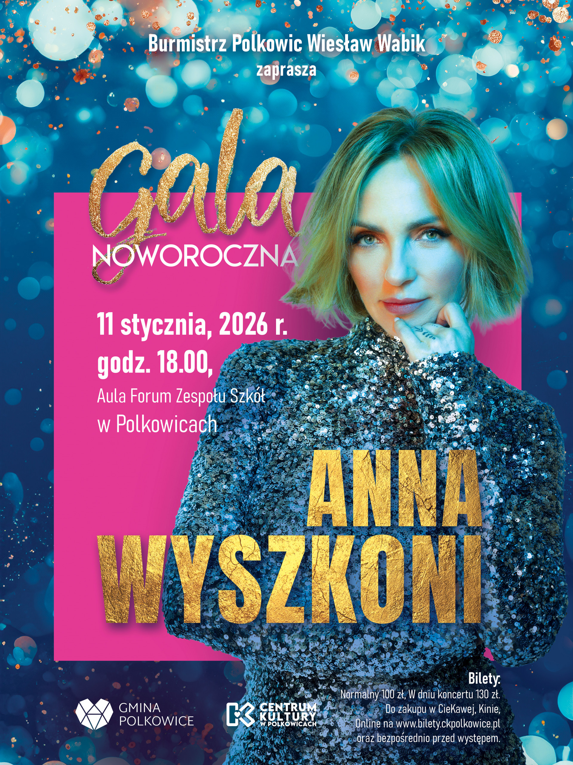 | Miejscowość: Polkowice Miejsce: Aula Forum Zespołu Szkół w Polkowicach Data rozpoczęcia: 11.01.2026 18:00:00 Data zakończenia: 11.01.2026 21:00:00 Organizator: Centrum Kultury w Polkowicach Opis wydarzenia: Gala Noworoczna z Anną Wyszkoni – rozpocznij 2026 rok wyjątkowym koncertem Polkowice po raz kolejny przywitają nowy rok w muzycznej oprawie, a na scenie pojawi się jedna z najbardziej rozpoznawalnych i cenionych artystek w Polsce - Anna Wyszkoni. Wraz z Burmistrzem Polkowic zapraszamy na Galę Noworoczną, która odbędzie się 11 stycznia 2026 roku o godzinie 18.00 w Auli Forum Zespołu Szkół w Polkowicach. Od niemal trzech dekad Anna Wyszkoni pozostaje jedną z najważniejszych postaci polskiej muzyki. Jej wspaniały głos, ponad pół miliona sprzedanych płyt i imponujący dorobek potwierdzają, że każdy koncert jest wyjątkowym wydarzeniem. Anna Wyszkoni Artystka jest obecna na polskiej scenie muzycznej od 29 lat. W tym czasie wydała łącznie 13 płyt i wylansowała wiele przebojów, które na stałe zapisały się w kanonie polskiej muzyki. Co jednak najważniejsze zapisały się w pamięci słuchaczy, którzy od lat nie opuszczają żadnej trasy koncertowej swojej idolki, która w następnym roku obchodzić będzie jubileusz 30-lecia działalności artystycznej. Jej albumy „Pan i pani” i „Życie jest w porządku” osiągnęły status podwójnie platynowych, a „Jestem tu nowa” pokryła się złotem. Status złotej płyty osiągnęły również „Kolędy wielkie”. W 2021 z okazji jubileuszu 25-lecia pracy artystycznej ukazał się dwupłytowy album z największymi przebojami „Nieznośna lekkość hitu”. Rok później artystka wydała płytę „Z cegieł i z łez”, a w roku 2023 album „10” poświęcony legendzie polskiego rocka Markowi Jackowskiemu i zespołowi Maanam. Anna ma w swoim repertuarze również wyjątkowe duety, m.in z Michałem Bajorem, Markiem Jackowskim, Piotrem Cugowskim czy przedstawicielem młodej sceny alternatywnej, Tymkiem. Bilety Bilety w cenie 100 zł (przedsprzedaż) oraz 130 zł (w dniu koncertu) do nabycia od 28 listopada 2025 roku w CieKawej, Kinie, online na stronie www.bilety.ckpolkowice.pl/MSI oraz bezpośrednio przed występem. Koncert to doskonała okazja, by rozpocząć rok w nastroju pełnym muzycznej energii i elegancji. Kup bilet już dziś i rozpocznij rok 2026 w towarzystwie wielkiej gwiazdy polskiej sceny. Bilet na koncert to idealny prezent na Święta! Gala Noworoczna to także świetny pomysł na prezent – bilety mogą stać się wyjątkowym podarunkiem mikołajkowym lub świątecznym, który z pewnością ucieszy każdego miłośnika dobrej muzyki. Jeśli jesteś zainteresowany kupnem biletu w prezentowej formie, napisz do 17 grudnia na adres e-mail: promocja@ckpolkowice.pl |