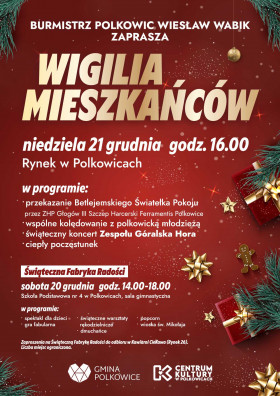 | Miejscowość: Polkowice Miejsce: Rynek w Polkowicach Data rozpoczęcia: 20.12.2025 14:00:00 Data zakończenia: 21.12.2025 16:00:00 Organizator: Centrum Kultury w Polkowicach Opis wydarzenia: Wigilia Mieszkańców i Świąteczna Fabryka Radości – weekend pełen atrakcji w świątecznym klimacie! Wraz z Burmistrzem Polkowic serdecznie zapraszamy na świąteczne wydarzenia! W dniach 20 i 21 grudnia Polkowice wypełnią się świątecznym klimatem, wspólnym kolędowaniem i mnóstwem atrakcji dla całych rodzin. Wigilia Mieszkańców Tegoroczna Wigilia Mieszkańców odbędzie się 21 grudnia 2025 o godz. 16:00 na polkowickim Rynku. To okazja, aby spotkać sąsiadów, złożyć sobie nawzajem życzenia i wspólnie świętować ten wyjątkowy czas. Podczas wydarzenia odbędzie się przekazanie Betlejemskiego Światła Pokoju przez harcerzy z ZHP Głogów III Szczep Harcerski Ferramentis Polkowice. Nie zabraknie też wspólnego kolędowania - lokalny akcent zapewni młodzież z Katolickiej Publicznej Szkoły Podstawowej im. św. Jana Pawła II. Wieczór uświetni świąteczny koncert gwiazdy wieczoru - Góralska Hora. Dla uczestników przygotowany będzie także ciepły, świąteczny posiłek, który umili wspólne spędzanie czasu. Świąteczna Fabryka Radości Dzieci wraz z rodzinami zapraszamy na dzień pełen atrakcji w Świątecznej Fabryce Radości, który odbędzie się 20 grudnia w godzinach 14.00-18.00 w sali gimnastycznej w Szkole Podstawowej nr 4 w Polkowicach. Czeka na Was moc zabawy, twórczych wyzwań i magicznych spotkań. W programie wydarzenia: Spektakl teatralny - emocjonująca przygoda z Grinchem i elfami, która pokaże, że prawdziwa magia świąt tkwi w przyjaźni i dobroci. Gra fabularna - dziewięć tematycznych stanowisk z zagadkami logicznymi, grami drewnianymi i wielkoformatowymi. Dzieci zbierają naklejki i zdobywają nagrody, a współpraca zespołowa mile widziana! Warsztaty rękodzielnicze - kreatywne prace i ozdoby świąteczne, które każdy uczestnik zabierze do domu. Wioska Świętego Mikołaja - spotkanie z Mikołajem, wspólne zdjęcia i wysyłanie listów z życzeniami. Dodatkowe atrakcje - dmuchańce, popcorn, malowanie buziek, brokatowe tatuaże i wiele innych niespodzianek. Bezpłatne zaproszenia można odebrać w Kawiarni CieKawa. Liczba miejsc ograniczona. Przyjdźcie z rodziną i przyjaciółmi - spędźmy razem radosne, świąteczne chwile przed Bożym Narodzeniem! |