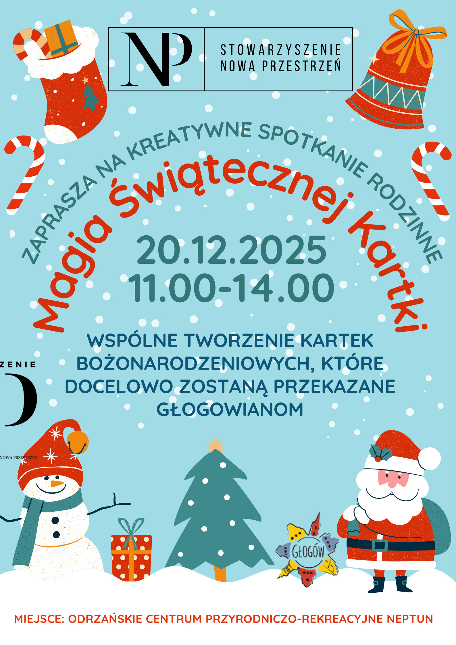 | Miejscowość: Głogów Miejsce: Odrzańskie Centrum Przyrodniczo-Rekreacyjne NEPTUN Data rozpoczęcia: 20.12.2025 11:00:00 Data zakończenia: 20.12.2025 14:00:00 Organizator: Stowarzyszenie Nowa Przestrzeń Opis wydarzenia: Stowarzyszenie Nowa Przestrzeń zaprasza na wspólne tworzenie kartek bożonarodzeniowych W świątecznej gonitwie łatwo zatracić to, co najważniejsze – chwile bliskości i radości spędzone z tymi, których kochamy. Dlatego zapraszamy wszystkich rodziców, dziadków i opiekunów do wspólnego stworzenia świątecznych kartek razem z dziećmi i wnukami. Podczas spotkania będziemy wycinać, malować, kleić i stworzyć wyjątkowe, własnoręcznie przygotowane kartki pełne ciepła i serdeczności. To doskonała okazja, aby na chwilę zwolnić tempo, pobyć razem i dać najmłodszym przestrzeń na kreatywność. Gotowe Kartki zostaną następnie przekazane głogowianom napotkanym na ulicach naszego miasta. Mamy nadzieję, ze życzenia i uśmiechy zapisane na kolorowych kartkach ocieplą ich dzień i wprowadzą odrobinę magii świąt w codzienny pośpiech. Nieważne, czy macie zdolności plastyczne, czy dopiero chcecie je odkryć – w świątecznej atmosferze spędźmy ten czas razem. Przyjdźcie i stwórzcie z nami coś pięknego - nie tylko kartki, ale i wspomnienia. Zapewniamy materiały plastyczne na tę okoliczność. Spotkajmy się w: Odrzańskie Centrum Przyrodniczo-Rekreacyjne NEPTUN sobota 20 grudnia 11:00 –14:00 PROJEKT WSPÓŁFINANSOWANY JEST ZE ŚRODKÓW GMINY MIEJSKIEJ GŁOGÓW |