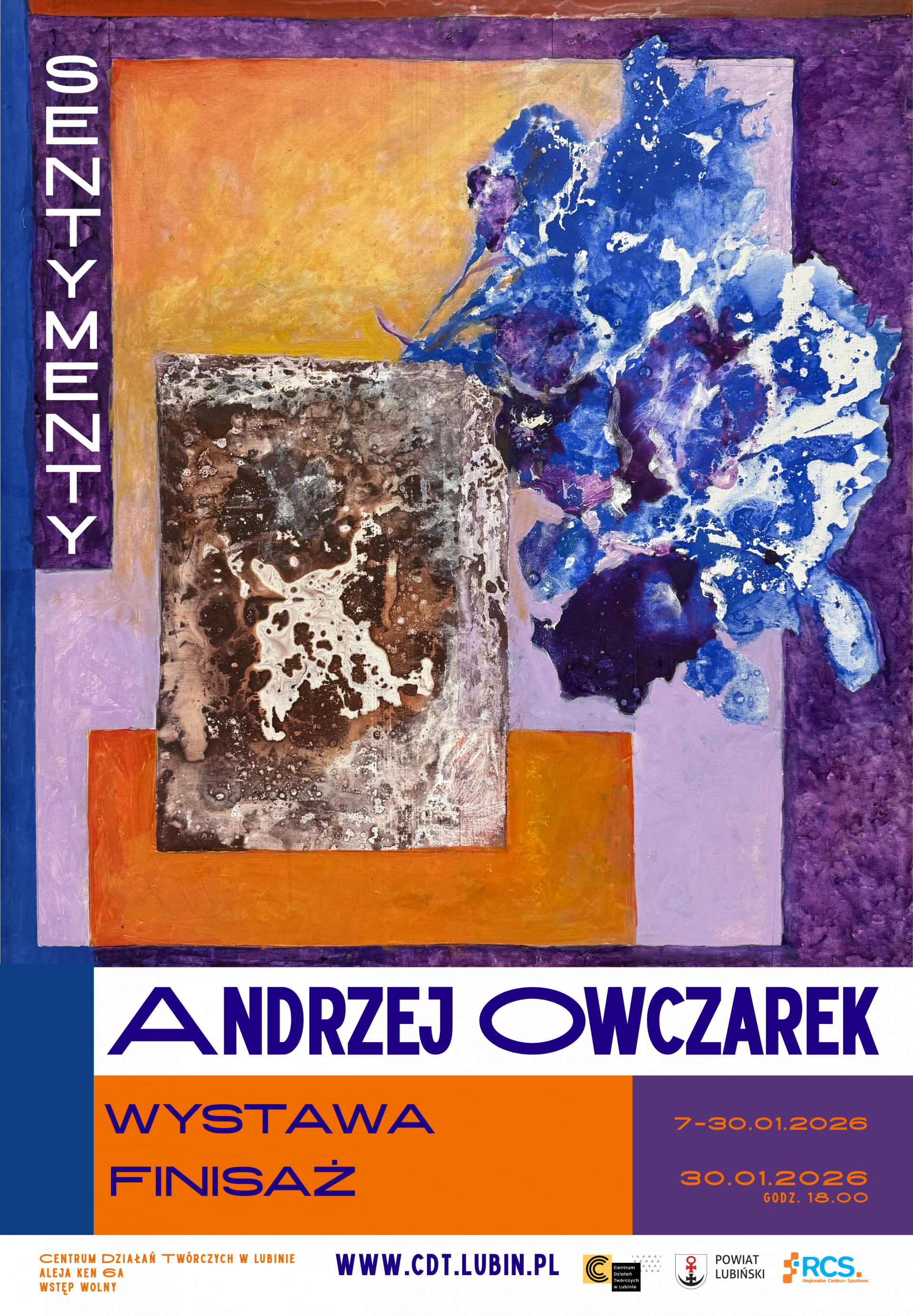 Miejscowość: Lubin Miejsce: Centrum Działań Twórczych w Lubinie Data rozpoczęcia: 07.01.2026 18:00:00 Data zakończenia: 30.01.2026 19:00:00 Organizator: Centrum Działań Twórczych w Lubinie Opis wydarzenia: Centrum Działań Twórczych w Lubinie zaprasza na wyjątkową wystawę „SENTYMENTY” – prezentację najnowszych prac Andrzeja Jerzego Jana Owczarka – wybitnego polskiego malarza, reżysera i scenografa, architekta wnętrz, a także jednej z najważniejszych postaci życia artystycznego Zagłębia Miedziowego.