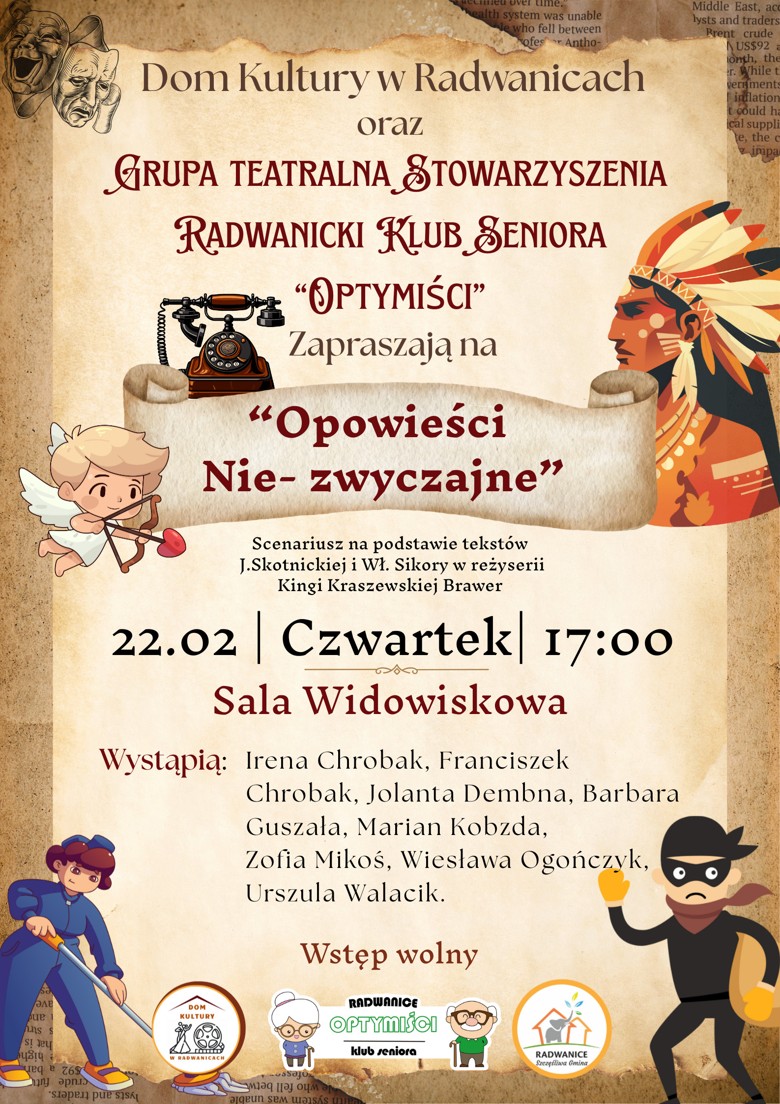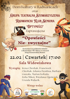 Z okazji zbliżających się dnia babci i dziadka Seniorzy ze stowarzyszenia Radwanicki Klub Seniora "Optymiści" zapraszają na wieczór teatralny i humorystyczne scenki wg. scenariusza na podstawie tekstów J.Skotnickiej i Wł. Sikory w reżyserii Kingi Kraszewskiej Brawer. Sztuka z cyklu Seniorzy- seniorom. Wstęp Wolny.
