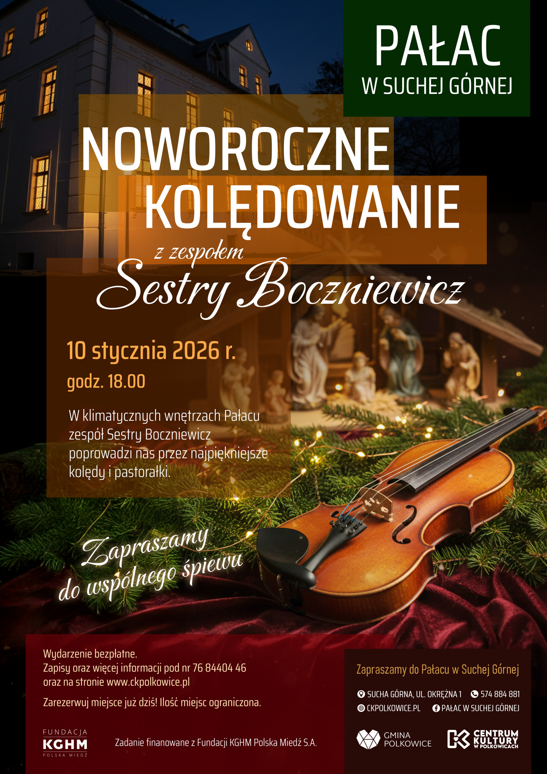 Spotkamy się 10 stycznia 2026 roku o godz. 18:00 w Pałacu w Suchej Górnej. W klimatycznych wnętrzach pałacu wspólnie zaśpiewamy najpiękniejsze kolędy i pastorałki. Zespół Sestry Boczniewicz, przy dźwiękach skrzypiec, poprowadzi nas przez znane świąteczne melodie i stworzy ciepłą, kameralną atmosferę na zimowy wieczór.