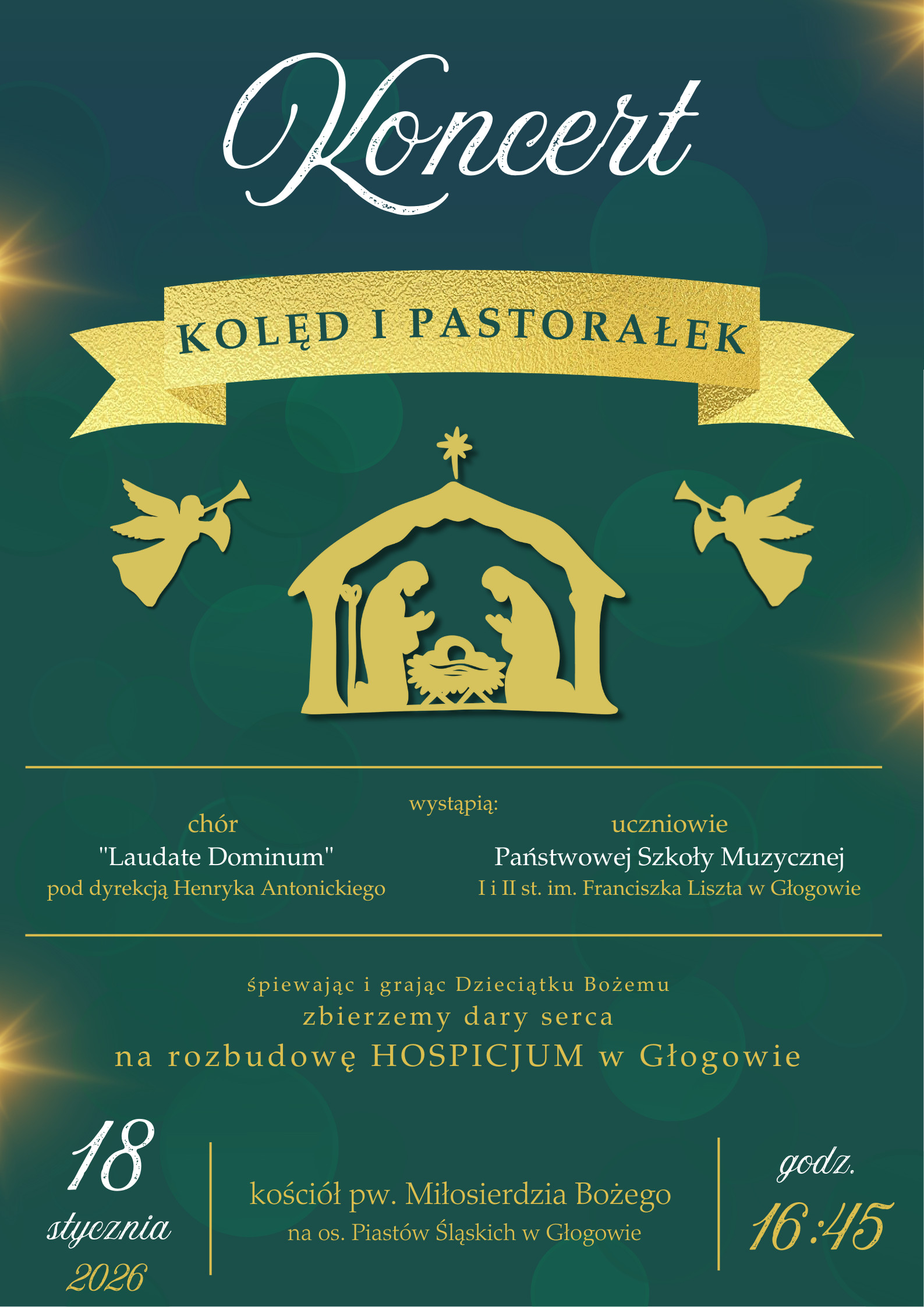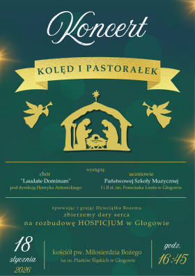 | Miejscowość: Głogów Miejsce: kościół pw. Miłosierdzia Bożego na os. Piastów Śląskich Data rozpoczęcia: 18.01.2026 16:45:00 Data zakończenia: 18.01.2026 18:00:00 Organizator: Parafia Miłosierdzia Bożego w Głogowie, Państwowa Szkoła Muzyczna I i II stopnia im. Franciszka Liszta w Głogowie Opis wydarzenia: Śpiewaniem i graniem pomagamy hospicjum! Zapraszamy na wspólny koncert chóru "Laudate Dominum" oraz uczniów Państwowej Szkoły Muzycznej w Głogowie, który odbędzie się w kościele pw. Miłosierdzia Bożego na osiedlu Piastów Śląskich w Głogowie. Podczas koncertu prowadzona będzie zbiórka na rzecz rozbudowy Hospicjum Głogowskiego. Chór pod kierunkiem Henryka Antonickiego oraz uczniowie głogowskiej szkoły muzycznej wykonają kolędy i pastorałki oraz melodie kojarzące się z radością Świąt Bożego Narodzenia. Zabrzmią znane i lubiane kolędy w wersji wokalnej, instrumentalnej oraz wokalno-instrumentalnej. niedziela, 18 stycznia 2026 r. godz. 16:45 kościół pw. Miłosierdzia Bożego na os. Piastów Śląskich Serdecznie zapraszamy! |