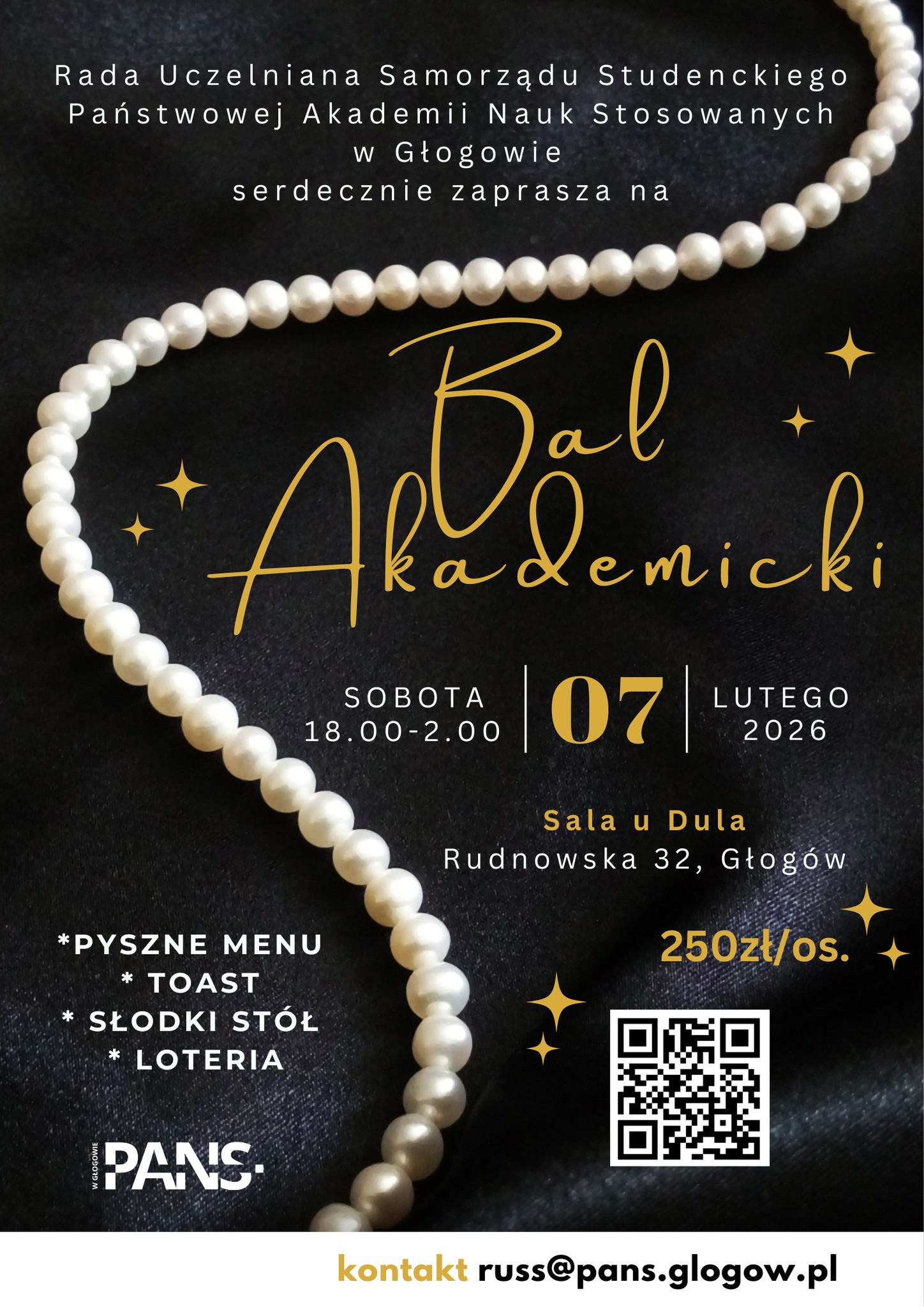 | Miejscowość: Głogów Miejsce: Sala Bankietowa u Dula Data rozpoczęcia: 07.02.2026 18:00:00 Data zakończenia: 08.02.2026 02:00:00 Organizator: Państwowa Akademia Nauk Stosowanych w Głogowie - Rada Uczelniana Samorządu Studenckiego Opis wydarzenia: Zapraszamy, całą społeczność akademicką: Władze Uczelni, Studentów i Absolwentów, Nauczycieli akademickich, Pracownicy Uczelni wraz z osobami towarzyszącymi na wyjątkowe wydarzenie: BAL AKADEMICKI. Koszt udziału: 250 zł / osoba Atrakcje wieczoru: DJ – najlepsza muzyka do tańca, Fotobudka 360 i ścianka do zdjęć Loteria z nagrodami – vouchery od lokalnych firm Wykwintne menu: dwudaniowy obiad zimne przekąski i dwa gorące dania, kawa, herbata, woda, soki, napoje gazowane, desery. Płatność możliwa: - przelewem bankowym: nr konta: 74249000050000400041475133 Odbiorca: Marta Łoś Tytuł przelewu: „BILET BAL AKADEMICKI imię i nazwisko, liczba osób” -BLIKiem: nr telefonu: 509 233 846 Tytuł: „BAL AKADEMICKI imię i nazwisko, liczba osób” kontakt: russ@pans.glogow.pl Nie przegap najbardziej eleganckiego wydarzenia akademickiego roku! Zarezerwuj swoje miejsce i spędź z nami niezapomniany wieczór! |
