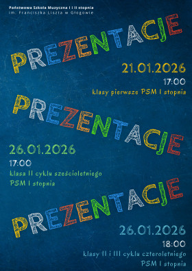 Kolejne prezentacje uczniów szkoły I stopnia będą miały miejsce 26 stycznia. O godz. 17:00 odbędzie się koncert całej klasy drugiej cyklu sześcioletniego, a o 18:00 wspólny koncert uczniów klas II i III cyklu czteroletniego.