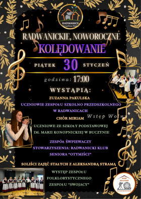 | Miejscowość: Radwanice Miejsce: Dom Kultury w Radwanicach Data rozpoczęcia: 30.01.2026 17:00:00 Data zakończenia: 30.01.2026 19:00:00 Organizator: Dom Kultury w Radwanicach Opis wydarzenia: Styczeń to wciąż wyjątkowy czas – miesiąc radości z Narodzin Bożych, ciepła, bliskości i wspólnego śpiewania. To właśnie kolędy od pokoleń łączą ludzi, niosą nadzieję i przypominają nam, jak wielką siłę ma wspólne wyśpiewywanie radości Zapraszamy na magiczny wieczór kolęd w sali widowiskowej, podczas którego na scenie wystąpią nasi lokalni artyści, dzieląc się talentem, sercem i prawdziwą świąteczną atmosferą Gościem specjalnym koncertu będzie Zuzanna Pakulska z Głogowa – dwukrotna laureatka, zdobywczyni I miejsca Przeglądu Talentów Zagłębia Miedziowego „Miedź albo nie mieć”. Na scenie zobaczymy również: Zespół Śpiewaczy Stowarzyszenia Radwanicki Klub Seniora „Optymiści” Chór Miriam, Finałowy występ przygotowali "Swojacy" Zespół Folklorystyczny z Radwanic. Uczniów, ze szkół podstawowych z terenów Gminy Radwanice, oraz podopiecznych znanej w Zagłębiu Miedziowym chórmistrzyni Aleksandry Stramy. To wspaniała okazja, by spędzić piątkowe popołudnie w gronie rodziny, przyjaciół i sąsiadów – zapraszamy seniorów, rodziców z dziećmi i wszystkich miłośników kolędowania 30 stycznia (piątek) Godzina 17:00 Sala widowiskowa Wstęp wolny Zapraszamy wszystkich całymi rodzinami. |
