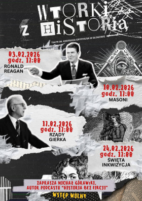 | Miejscowość: Głogów Miejsce: Teatr im. Andreasa Gryphiusa, Rynek 8 Data rozpoczęcia: 10.02.2026 17:00:00 Data zakończenia: 10.02.2026 20:00:00 Organizator: CENTRUM KULTURY W GŁOGOWIE Opis wydarzenia: Zapraszamy na kolejną odsłonę cyklu „Wtorki z historią” – spotkań, podczas których cofamy się w czasie, by przyjrzeć się postaciom, wydarzeniom i zjawiskom, które ukształtowały świat, w jakim dziś żyjemy. W lutym porozmawiamy o polityce, ideologiach, tajemnicach i religii, o tematach, które do dziś wzbudzają emocje i kontrowersje. 10 lutego – Masoni, godz. 17:00 Czy rządzą światem? Czym jest ulubione stowarzyszenie entuzjastów teorii spiskowych? Wstęp wolny. |