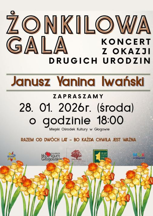 | Miejscowość: Głogów Miejsce: Centrum Kultury MOK Data rozpoczęcia: 28.01.2026 18:00:00 Data zakończenia: 28.01.2026 20:00:00 Organizator: Miejski Ośrodek Kultury w Głogowie, Fundacja Hospicjum Głogowskie Opis wydarzenia: 28 stycznia 2026r. godz 18:00 Centrum Kultury ŻONKILOWA GALA Z OKAZJI II URODZIN HOSPICJUM GŁOGOWSKIEGO Serdecznie zapraszamy na wyjątkową, jubileuszową "Żonkilową Galę" - koncert organizowany z okazji drugich urodzin Głogowskiego Hospicjum. To będzie wieczór pełen muzyki, wzruszeń i wspólnego świętowania – bo każda chwila jest ważna. Wystąpią: ń Środa | 28.01.2026 18:00 CK MOK Wstęp wolny! Wydarzenie organizowane wspólnie z Fundacja Hospicjum Głogowskie oraz partnerami. Zapraszamy wszystkich, którym bliska jest idea wsparcia, solidarności i pięknej muzyki. Bądźcie z nami w tym ważnym dniu! |