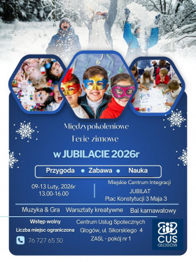 | Miejscowość: Głogów Miejsce: Miejskie Centrum Integracji Jubilat Data rozpoczęcia: 09.02.2026 13:00:00 Data zakończenia: 13.02.2026 16:00:00 Organizator: Centrum Usług Społecznych w Głogowie Opis wydarzenia: Międzypokoleniowe Ferie Zimowe w Jubilacie! Centrum Usług Społecznych serdecznie zaprasza dzieci wraz z dziadkami do wspólnego udziału w wyjątkowych feriach zimowych, pełnych radości, kreatywności i wspólnej zabawy. To doskonała okazja, aby aktywnie i ciekawie spędzić wolny czas w bezpiecznej i przyjaznej atmosferze. • W dniach 09.02. do 13.02.2026 r. • Godz. 13:00-16:00 • Miejskie Centrum Integracji Jubilat Zapraszamy dzieci z Gminy Miejskiej Głogów w wieku od 7 do 13 lat z dziadkami W planie m.in.: - gry i zabawy ruchowe oraz integracyjne - warsztaty kreatywne rozwijające zdolności manualne i artystyczne - bal karnawałowy pełen muzyki, tańca i kolorowych strojów - wiele niespodzianek i atrakcji, które sprawią, że ferie będą niezapomniane. Obowiązują zapisy w Centrum Usług Społecznych w Głogowie, ul. Sikorskiego 4 – liczba miejsc ograniczona. Do zobaczenia na feriach! Zespół Aktywizacji Społeczności Lokalnej Tel. 76 7276530/ 76 7276557 |