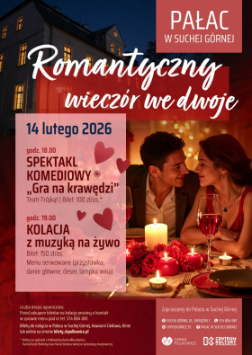 | Miejscowość: Sucha Górna Miejsce: Pałac w Suchej Górnej Data rozpoczęcia: 14.02.2026 18:00:00 Data zakończenia: 14.02.2026 20:00:00 Organizator: Centrum Kultury w Polkowicach Opis wydarzenia: W Walentynki, 14 lutego 2026 r., zapraszamy do Pałacu w Suchej Górnej na wyjątkowy „Romantyczny Wieczór we Dwoje”, które połączy teatr, muzykę i romantyczną atmosferę pałacowych wnętrz. Tego wieczoru w Pałacu w Suchej Górnej odbędzie się spektakl teatralny tylko dla dorosłych pt. „Gra na krawędzi” w wykonaniu Teatru Trójkąt. To zaskakująca w swoim przebiegu sztuka na dwoje aktorów, która nieustannie igra z percepcją widza. W miarę rozwoju akcji rzeczywistość, która wydaje się oczywista, kilkakrotnie ulega zmianie, zmuszając odbiorców do ponownego składania wszystkich elementów opowieści. "Gra na krawędzi" to spójna, dekonstrukcyjna forma teatralna, rozpoczynająca się w rzeczywistości wykreowanej, a kończąca w realnym „tu i teraz”. Spektakl zachwyca zarówno humorem, co potwierdzają reakcje publiczności, jak i głębią poruszanych tematów. Opowiada o relacjach w małżeństwie, sensie istnienia i emocjach, które każdy z nas zna, dlatego pozostawia widzów z refleksją długo po zakończeniu przedstawienia. Bilety na spektakl: 100 zł / os. Z Polkowicką Kartą Mieszkańca, Kartą Dużej Rodziny oraz Kartą Seniora taniej w sprzedaży stacjonarnej. Po spektaklu zapraszamy na wyśmienitą kolację przy muzyce na żywo. Starannie skomponowane menu, nastrojowe dźwięki i elegancka oprawa sprawią, że „Romantyczny Wieczór we Dwoje” stanie się prawdziwą ucztą dla zmysłów. Wszystko odbędzie się w pięknych, pałacowych przestrzeniach, które dodadzą wydarzeniu romantyzmu, klasy i niepowtarzalnego klimatu. To idealna okazja, by spędzić Walentynki w niezwykły sposób - we dwoje lub w gronie przyjaciół. Bilety na kolację: 150 zł / os. Przed zakupem biletów na kolacje prosimy o kontakt w sprawie menu pod nr tel. 574 884 881. Bilety do nabycia w Pałacu w Suchej Górnej, Kawiarni CieKawa, Kinie oraz online na www.bilety.ckpolkowice.pl/MSI |