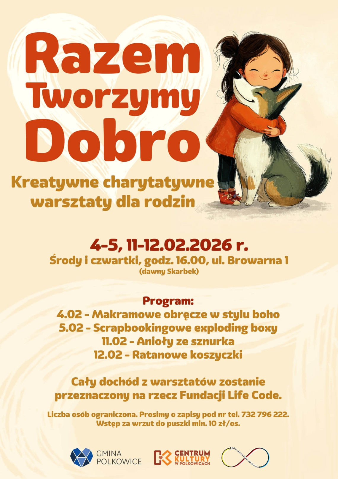 | Miejscowość: Polkowice Miejsce: ul. Browarna 1 Data rozpoczęcia: 11.02.2026 16:00:00 Data zakończenia: 12.02.2026 16:00:00 Organizator: Centrum Kultury w Polkowicach Opis wydarzenia: Razem Tworzymy Dobro – rodzinne warsztaty charytatywne podczas ferii zimowych Ferie to idealny moment, żeby zatrzymać się na chwilę i pobyć razem. Bez pośpiechu, bez ekranów, za to z rozmową, śmiechem i wspólnym tworzeniem. Jeśli szukacie pomysłu na rodzinny, kreatywny czas, te warsztaty są właśnie dla Was. W czasie ferii zimowych Polkowickie Centrum Wolontariatu poprowadzi kreatywne warsztaty charytatywne „Razem Tworzymy Dobro”. Każde spotkanie to inna forma twórczej zabawy. Spotykamy się w środy i czwartki o godzinie 16:00, przy ul. Browarnej 1. Program warsztatów: 4 lutego 2026 – makramowe obręcze w stylu boho 5 lutego 2026 – scrapbookingowe exploding boxy 11 lutego 2026 – anioły ze sznurka 12 lutego 2026 – ratanowe koszyczki Udział w warsztatach odbywa się w formie wrzutu do puszki (minimum 10 zł od osoby). Cały dochód ze spotkań trafia do Fundacji LifeCode, która pomaga zwierzętom. Biorąc udział, nie tylko spędzacie wartościowy czas z bliskimi, ale też robicie coś naprawdę dobrego. To piękny przykład dla dzieci, że wspólne działania mogą mieć realny sens i wpływ. Liczba miejsc jest ograniczona, dlatego obowiązują wcześniejsze zapisy pod numerem telefonu 732 796 222. |