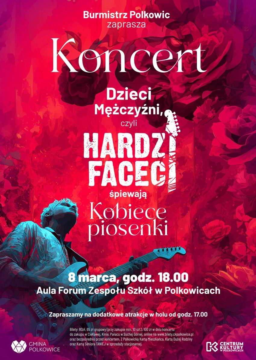 | Miejscowość: Polkowice Miejsce: Aula Forum Zespołu Szkół w Polkowicach Data rozpoczęcia: 08.03.2026 18:00:00 Data zakończenia: 08.03.2026 19:30:00 Organizator: Centrum Kultury w Polkowicach Opis wydarzenia: „Dzieci Mężczyźni, czyli hardzi faceci śpiewają kobiece piosenki” 8 marca 2026 | Aula Forum Zespołu Szkół w Polkowicach | Bilety już w sprzedaży! Drogie Panie, to Wasz Wieczór! Szukacie idealnego sposobu na świętowanie Dnia Kobiet? Najtwardsi i najbardziej niepokorni wokaliści wracają do Polkowic, by pokazać swoje najdelikatniejsze oblicze! To nie jest zwykły koncert. To wydarzenie, które podbiło Wasze serca, a teraz wraca z nową energią i odświeżonym repertuarem! Zobaczycie, jak męska charyzma łączy się z kultowymi hitami największych polskich wokalistek. Gwarantujemy Wam muzykę na żywo, mnóstwo emocji i dobrego humoru i niezapomnianą atmosferę! Widzimy się już 8 marca w Auli Forum w Polkowicach przy ul. Skalników 6, gdzie od godziny 17:00 czekają na Was wyjątkowe atrakcje w foyer, a o 18:00 rozpocznie się niezapomniany koncert. Bilety w cenie 80 zł normalny, 65 zł grupowy (min. 10 osób), 100 zł w dniu wydarzenia zakupicie online: www.bilety.ckpolkowice.pl/msi oraz stacjonarnie w Kawiarni CieKawa, Kinie, Pałacu w Suchej Górnej oraz bezpośrednio przed koncertem. Z Polkowicką Kartą Mieszkańca, Kartą Dużej Rodziny oraz Kartą Seniora Taniej w sprzedaży stacjonarnej! (nie dotyczy biletów grupowych) |