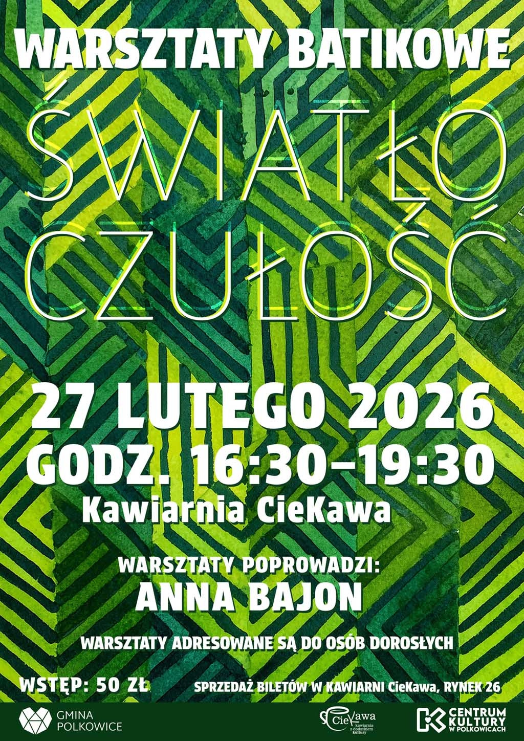 | Miejscowość: Polkowice Miejsce: CieKawa, Salon, Rynek 26-27 Data rozpoczęcia: 27.02.2026 16:30:00 Data zakończenia: 27.02.2026 19:30:00 Organizator: Centrum Kultury w Polkowicach Opis wydarzenia: Zapraszamy dorosłych miłośników sztuki i twórczych działań na warsztaty batikowe „Światłoczułość”. Warsztaty odbędą się 27 lutego 2026 roku w godzinach 16:30-19:30 w Kawiarni CieKawa. To twórcze spotkanie z tkaniną, światłem i kolorem. Podczas warsztatów uczestnicy stworzą własny batik inspirowany naturą i grą światła. Batik to tradycyjna technika malarska polegająca na nakładaniu wosku na tkaninę i barwieniu jej w kąpielach z farbą. Kolor pojawia się tylko tam, gdzie nie ma wosku, co daje niepowtarzalne przejścia barw i zaskakujące efekty. Każda praca jest jedyna w swoim rodzaju. Praca z woskiem i barwnikiem pozwala zwolnić, poeksperymentować i stworzyć coś naprawdę niepowtarzalnego, bez względu na wcześniejsze doświadczenie. Warsztaty poprowadzi Anna Bajon – malarka i arteterapeutka, absolwentka malarstwa Uniwersytetu Pedagogicznego w Krakowie oraz arteterapii na Akademii Pedagogiki Specjalnej w Warszawie. Jej prace były prezentowane na licznych wystawach w całej Polsce, m.in. w Zamku Piastowskim w Legnicy, Pałacu Prezydenckim i Pałacu Kazimierzowskim w Warszawie, Piwnicy pod Baranami w Krakowie czy Galerii Sztuki Pacykarz w Legnicy. Artystka jest laureatką wielu nagród, w tym I miejsca na Międzynarodowym Przeglądzie Tkaniny Artystycznej „Silezjany 2021”. Warsztatom towarzyszyć będzie wystawa prac batikowych artystki. Warsztaty skierowane są do osób dorosłych. Wstęp: 50 zł. Bilety dostępne są w Kawiarni CieKawa (Rynek 26) w sprzedaży stacjonarnej. Zapraszamy do wspólnego, twórczego popołudnia w spokojnej i inspirującej atmosferze Kawiarni CieKawa. |
