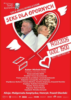 | Miejscowość: Głogów Miejsce: Teatr im. Andreasa Gryphiusa, Rynek 8 Data rozpoczęcia: 14.03.2026 19:00:00 Data zakończenia: 14.03.2026 20:00:00 Organizator: CENTRUM KULTURY W GŁOGOWIE Opis wydarzenia: 14.03.2026 GODZ. 19:00 BILETY: 130 zł TEATR IM ANDREASA GRYPHIUSA W GŁOGOWIE „Seks dla opornych” to przedstawienie opowiadające o parze dojrzałych ludzi, którzy na pewnym etapie swojego wspólnego życia poczuli nieodpartą potrzebę jego odmiany. Ucieczki od powszedniości i sankcjonowanej przez utarte schematy rutyny codziennego, zwykłego życia małżeństwa w średnim wieku. Wyjeżdżają do eleganckiego hotelu, odrywają się od obowiązków, pracy, rodziny z nadzieją, że w ciągu kilku dni wydarzy się coś, co wprowadzi w ich związek ożywcze tchnienie, odświeży ich relacje i lekko spatynowane przez czas uczucie. „Seks dla opornych” to komedia, w której sytuacje wyjęte z klasycznej farsy towarzyszą scenom romantycznym i wzruszającym. Dokładnie tak jak w naszym życiu, które przecież czasem bywa niezwykłe i cudowne po to by za chwilę stać się nudne, przewidywalne, ale też i śmieszne w sposób niezamierzony i zaskakujący. Obsada: Alicja: Małgorzata Szeptycka Henryk: Paweł Okoński Twórcy: Autor: Michele Riml Przekład: Hanna Szczerkowska Prawa autorskie do przekładu: Jurand Szczerkowski Reżyseria i scenografia: Paweł Okoński Współpraca: Barbara i Tomasz Okońscy Karolina Szeptycka Krzysztof Stachów Projekcje: Radosław Kasiukiewicz Światła: Bartosz Kondys Nagrania: Robert Maniak Czas trwania: 90 minut |