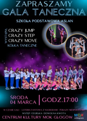 Zapraszamy na prezentacje taneczne uczniów kół tanecznych ze Szkoły Podstawowej ASLAN w Głogowie: Crazy Jump, Crazy Step i Crazy Move, którzy na co dzień trenują pod czujnym okiem pani Anny Oliwy-Płaczek. Oprócz prezentacji tanecznych zaplanowano loterię fantową oraz kilka niespodzianek. Zapraszamy!