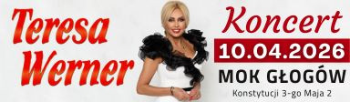 | Miejscowość: Głogów Miejsce: Centrum Kultury MOK Data rozpoczęcia: 10.04.2026 18:00:00 Data zakończenia: 10.04.2026 20:00:00 Organizator: Miejski Ośrodek Kultury w Głogowie Opis wydarzenia: 10. kwietnia 2025r. godz. 18.00 Centrum Kultury KONCERT TERESY WERNER Bilety: kupbilecik.pl Już 10 kwietnia wyjątkowy koncert Teresy Werner w Miejskim Ośrodku Kultury w Głogowie. Teresa Werner to polska piosenkarka pochodząca z Nakła Śląskiego. Kariera Teresy Werner przyspieszyła po nagraniu takich hitów jak "Miłość jest piękna", "Dałabym Ci dała" czy "Kocham swoje morze", które wielokrotnie i bezkonkurencyjnie wygrywały telewizyjne i radiowe listy przebojów. Jej kompozycje oraz teledyski są emitowane na antenach stacji radiowych i telewizyjnych. Dotychczas w dorobku artystki ukazały się płyty CD oraz DVD. Pierwszy album "Spełnić Marzenia" uzyskał najpierw status Złotej Płyty, a następnie Platynowej Płyty i Podwójnie Platynowej Płyty. Artystka została wyróżniona przez Ministra Kultury i Dziedzictwa Narodowego odznaką honorową "Zasłużony dla Kultury Polskiej". Teresa Werner znalazła się w prestiżowym leksykonie "Polki mają głos", w którym zaprezentowano 100 najbardziej wpływowych Polek na stulecie nadania praw wyborczych kobietom w Polsce. W lipcu 2013 Wyższa Rada Ekspertów Międzynarodowego Intelektualnego Społeczeństwa Niezależnego Międzynarodowego PEN Clubu odznaczyła piosenkarkę tytułem doktora honoris causa. Teresa Werner zrealizowała swoje wielkie marzenie i wyprodukowała własną ekskluzywną linię perfum dla kobiet i mężczyzn, które w krótkim czasie stały się absolutnymi bestsellerami! Z okazji jubileuszu 10-lecia solowej pracy artystycznej na rynku ukazała się złota limitowana edycja perfum. Piosenkarka wzięła udział w prestiżowym międzynarodowym festiwalu w chorwackim Szybeniku "Večeri dalmatinske šansone 2013", gdzie jej występ spotkał się z wielkim uznaniem dla jej twórczości. Teresa Werner jest stałym gościem w telewizyjnym programie "Śląska Karuzela" w Telewizji TVS, który prowadzony jest przez Sławomira i Kajrę, którzy z przyjemnością prezentują wszelkie nowości z artystycznego świata Teresy Werner. Obecnie promuje swój najnowszy już czwarty album CD "Sekret Miłości", a także książkę "Marzeniami do sukcesu". Nie zwalnia tempa i z całą pewnością jest najczęściej koncertującą artystką w Polsce. Ikona stylu dla kobiet, ideał piękna dla mężczyzn. Jedyna i niepowtarzalna - Teresa Werner. Serdecznie zapraszamy! |