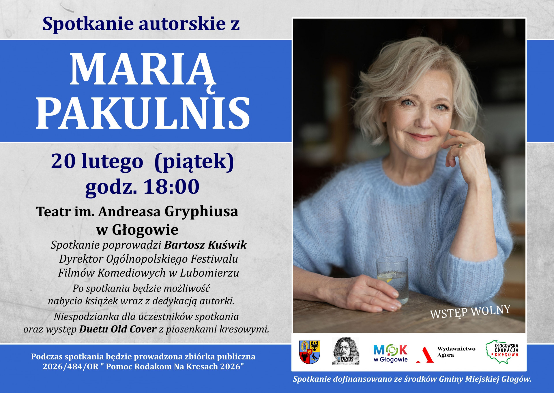| Miejscowość: Głogów Miejsce: Teatr im. Andreasa Gryphiusa Data rozpoczęcia: 20.02.2026 18:00:00 Data zakończenia: 20.02.2026 20:00:00 Organizator: Stowarzyszenie "Głogowska Edukacja Kresowa" - Spotkanie poprowadzi Bartosz Kuświk Opis wydarzenia: Zapraszamy na spotkanie aktorsko - autorskie z MARIĄ PAKULNIS w dniu 20 lutego 2026r. ( piątek) o godz. 18:00 do Teatru im. Andreasa Gryphiusa. Gwiazda, która błyszczała u Konwickiego, Kieślowskiego, Trelińskiego, w dziesiątkach przedstawień, filmów i seriali. Grała kobiety demoniczne i dziewice, intelektualistki i szefowe gangów, matki i córki, żony i kochanki. Jej twarz jest jedną z ikon kina moralnego niepokoju, a oczy o lodowym blasku nie mają sobie równych w polskim kinie. Niedawno wróciła na duży ekran, odnosząc ogromny sukces. Za drugoplanową rolę w „Johnnym” otrzymała Złotego Orła, najbardziej prestiżową nagrodę filmową w Polsce. Ale „Moja nitka” to coś więcej niż opowieść o aktorskiej karierze. Maria Pakulnis przy wsparciu Doroty Wodeckiej zagląda w miejsca, do których nie chce się wracać pamięcią, konfrontuje czytelników i siebie z mrocznymi obrazami własnego dzieciństwa, dojrzewania, z żałobą i stratą. W tej emocjonalnej, mądrej i intymnej rozmowie wrażliwych kobiet każdy odnajdzie okruchy swoich doświadczeń. "W filmie „Dolina Issy”, pierwszym, w jakim zagrałam, jeden z bohaterów zastanawia się, dlaczego innym jest dobrze, a jemu nie. I odpowiada sobie, że „być może każdemu dano taką nitkę, jego los i albo schwyci jej koniec i wtedy cieszy się, że postępuje jak należy, albo nie schwyci”. Wydaje mi się, że można zgubić nitkę, ale szczęściem jest spotkać ludzi, którzy pomogą ci ją złapać, albo na powrót włożą ci ją do ręki. I ja takich ludzi bezinteresownie mi życzliwych spotkałam. Aktorka filmowa, teatralna i telewizyjna. Absolwentka warszawskiej PWST (1980). Należy do grona najwybitniejszych aktorek średniego pokolenia, zdobyła szczególne uznanie zarówno wśród krytyków, jak i publiczności. Za swe artystyczne dokonania wielokrotnie wyróżniona nagrodami : nagrodą im. Zbyszka Cybulskiego, nagrodą aktorską na MFF w Taorminie, Brązowymi Lwami na Festiwalu Polskich Filmów Fabularnych w Gdańsku ,Złotym Ekranem, w 1998 r. odcisnęła swoją dłoń na Promenadzie Gwiazd w Międzyzdrojach. Już u progu kariery współpracowała z najważniejszymi reżyserami: T. Konwickim ("Dolina Issy"), Krzysztofem Kieślowskim ("Bez końca", "Dekalog III"), J. Zaorskim ("Jezioro Bodeńskie), A.Domalikiem ("Zygfryd), M.Gronowskim ("Weryfikacja"). Stworzyła całą galerię kobiecych postaci, choć najczęściej jest obsadzana w rolach atrakcyjnych, pewnych siebie i silnych kobiet. Zagrała niezapomniane role w "Obywatelu Piszczyku" A. Kotkowskiego, "Konsulu" M. Borka, "Pożegnaniu jesieni" M. Trelińskiego, "Pajęczarkach" B. Sass, "Rozdrożu Cafe" L. Wosiewicza. Telewizyjnej publiczności znana ze znakomitej roli Nadieżdy Tumskiej w serialu "Ekstradycja" W.Wójcika, jak również z innych produkcji tj. "Psie serce", "Siostry, "Wiadomości z drugiej ręki", "Nad Rozlewiskiem". Wystąpiła w ponad 40 spektaklach Teatru Telewizji m.in. w "Mahagonny", "Chorobie młodości", "Łuku Triumfalnym" , "Sprawie Stawrogina", "Słowie honoru" K. Zaleskiego, "Freuda teorii snów" A.Minkiewicz, "Pępowinie" P.Szulkina, "Wilku stepowym" T. Kotlarczyk, "Urodzinach" K. Nazara, "Pierwszym września" K. Langa. Zagrała wiele ról w bardzo zróżnicowanym repertuarze. Po ukończeniu studiów występowała w awangardowym Teatrze Dramatycznym w Słupsku. Od roku 1981 związana z teatrami warszawskimi: Współczesnym (1981-87) i Dramatycznym (1987). W latach 1989-2010 aktorka Teatru Ateneum w Warszawie. Współpracowała również z Teatrem Dramatycznym w Białymstoku. Obecnie występuje w stołecznym Teatrze Komedia i Teatrze Kamienica. Przez lata pracy na deskach teatru stworzyła wiele interesujących kreacji m.in. w "Małej Apokalipsie", "Burzy", "Mahagonny""Operze za trzy grosze", "Garderobianym", "Przyjęciu", "Życie: trzy wersje" K. Zaleskiego, "Śnie nocy letnie" M. Englerta, "Libertynie" W.Adamczyka, "Polowaniu na karaluchy" Laco Adamika "Scenach z życia małżeńskiego", "Kobiecie bez znaczenia" R. Szejda, "Locie nad kukułczym gniazdem", "Tektonice uczuć" J. Wernio. Maria Pakulnis pracuje także w Teatrze Polskiego Radia. Zajmuje się również dubbingiem do filmów dla dzieci i młodzieży, w 2000 i 2003 roku użyczyła swojego głosu Cruelli de Mon ze "101 Dalmatyńczykow". |
