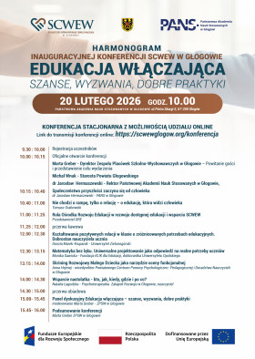 | Miejscowość: Głogów Miejsce: PANS w Głogowie Data rozpoczęcia: 20.02.2026 09:30:00 Data zakończenia: 20.02.2026 16:00:00 Organizator: Specjalistyczne Centrum Wspierające Edukację Właczającą w Głogowie Opis wydarzenia: Zapraszamy nauczycieli, rodziców, samorządowców i wszystkich, którym bliska jest edukacja – na konferencję „Edukacja włączająca – szanse, wyzwania, dobre praktyki”. Spotykamy się 20 lutego 2025 r. w Państwowa Akademia Nauk Stosowanych w Głogowie. Start o godz. 9.30. To będzie rozmowa o tym, jak mądrze i odpowiedzialnie budować edukację, która nikogo nie zostawia na marginesie. Dostępna będzie również relacja online na stronie SCWEW. Na nowej stronie SCWEW publikujemy wszystkie bieżące informacje dotyczące wydarzenia – zachęcam do śledzenia aktualności. Rejestracja na konferencję: https://scwewglogow.org/konferencja/ |