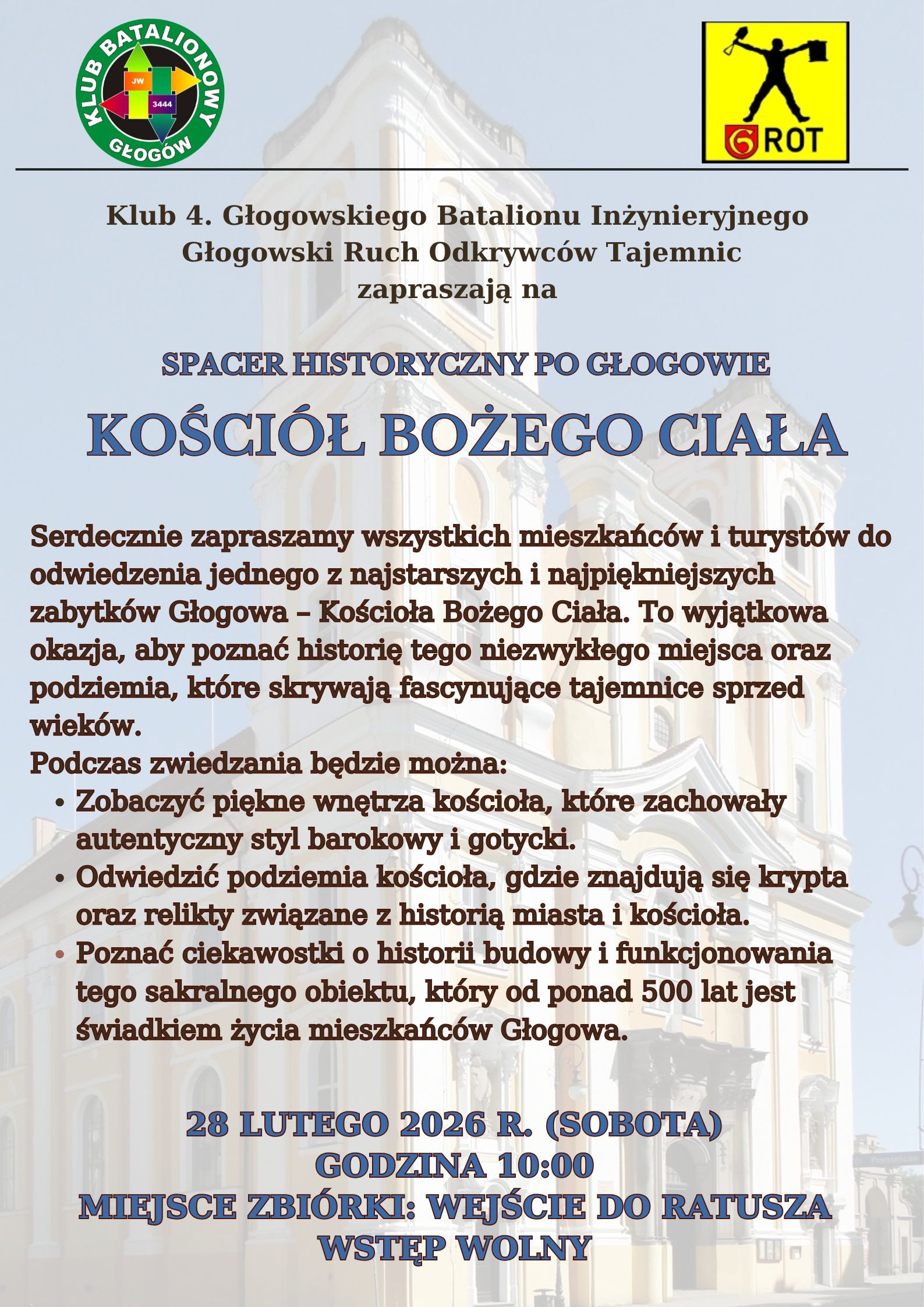 | Miejscowość: Glogów Miejsce: Kościół Bożego Ciała Data rozpoczęcia: 28.02.2026 10:00:00 Data zakończenia: 28.02.2026 12:00:00 Organizator: Klub Batalionowy Opis wydarzenia: Serdecznie zapraszamy wszystkich mieszkańców i turystów do odwiedzenia jednego z najstarszych i najpiękniejszych zabytków Głogowa – Kościoła Bożego Ciała. To wyjątkowa okazja, aby poznać historię tego niezwykłego miejsca oraz podziemia, które skrywają fascynujące tajemnice sprzed wieków. Podczas zwiedzania będzie można: Zobaczyć piękne wnętrza kościoła, które zachowały autentyczny styl barokowy i gotycki. Odwiedzić podziemia kościoła, gdzie znajdują się krypta oraz relikty związane z historią miasta i kościoła. Poznać ciekawostki o historii budowy i funkcjonowania tego sakralnego obiektu, który od ponad 500 lat jest świadkiem życia mieszkańców Głogowa. |