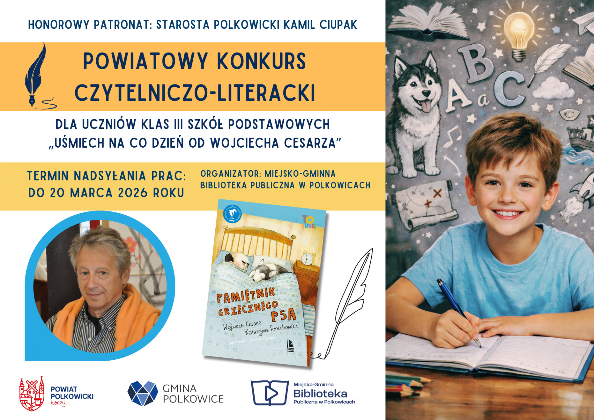 | Miejscowość: Polkowice Miejsce: Miejsko-Gminna Biblioteka Publiczna w Polkowicach Data rozpoczęcia: 24.02.2026 18:00:00 Data zakończenia: 20.03.2026 18:00:00 Organizator: Miejsko-Gminna Biblioteka Publiczna w Polkowicach Opis wydarzenia: Serdecznie zapraszamy uczniów klas trzecich z terenu powiatu polkowickiego do udziału w konkursie „Uśmiech na co dzień od Wojciecha Cesarza”. Mamy zaszczyt poinformować, że Honorowy Patronat nad konkursem objął Kamil Ciupak - Starosta Polkowicki. To wyjątkowa okazja, by wykazać się znajomością literatury i talentem literackim! Tegorocznym ambasadorem konkursu jest Wojciech Cesarz, ceniony autor literatury dziecięcej i młodzieżowej oraz artysta grafik, znany przede wszystkim jako współtwórca bestsellerowego cyklu „Pamiętnik grzecznego psa”. W swojej twórczości, wielokrotnie nagradzanej w Konkursie im. Astrid Lindgren, z humorem promuje empatię wobec zwierząt oraz ważne wartości moralne. Do udziału w konkursie zapraszamy uczniów z klas III ze szkół Powiatu Polkowickiego. Konkurs ma na celu wyzwolenie u dzieci kreatywności oraz zdolności literackich, popularyzowanie twórczości współczesnych pisarzy polskich, podnoszenie kultury czytelniczej uczniów, promowanie czytelnictwa i działań Biblioteki oraz aktywizację uczniów w środowisku szkolnym i pozaszkolnym. Zadanie konkursowe polega na napisaniu opowiadania przedstawiającego przygody tytułowego psa (Wintera), bohatera cyklu książek autorstwa Wojciecha Cesarza i Katarzyny Terechowicz pn. „Grzeczny Pies” („Pamiętnik grzecznego psa”, „Nowe przygody grzecznego psa” i inne). W opowiadaniu dzieci opisują wymyślone przez siebie przygody psa Wintera związane z książkami i biblioteką. Konkurs przebiegał będzie w dwóch etapach: Etap I - wewnątrzszkolny: Uczestnicy konkursu piszą konkursową pracę w szkole, pod nadzorem nauczyciela i przekazują mu ją. Spośród napisanych przez dzieci opowiadań, szkoła wybiera maksymalnie 20 najciekawszych prac, które przesyła na adres Organizatora. Etap II - powiatowy: Nadesłane do biblioteki prace zostaną ocenione przez Jury, a następnie zostaną wyłonieni laureaci konkursu. Laureaci konkursu otrzymają nagrody rzeczowe. Dodatkowo szkoły, których uczniowie zostali laureatami konkursu i zajęli w nim I, II i III miejsce, zostaną zaproszone na spotkanie autorskie z Wojciechem Cesarzem w siedzibie Biblioteki. Planowany termin spotkania oraz wręczenia nagród to 22 kwietnia (środa) 2026 roku. Prace konkursowe muszą być napisane odręcznie przez dzieci. Minimalna objętość opowiadania to 1,5 strony A4 w trzy linie (możliwość pobrania i wydruku z załącznika nr 4). Maksymalna objętość pracy to 2 strony A4 w trzy linie. Termin nadsyłania prac: do 20 marca 2026 roku. Oceniana będzie przede wszystkim kreatywność i pomysłowość dzieci oraz opis głównego bohatera spójny z postacią książkowego psa - Wintera, a także uwzględnienie przygód związanych z książkami i biblioteką. Szczegółowe informacje znajdują się w Regulaminie Konkursu. Zachęcamy do udziału! Książki z cyklu „Pamiętnik grzecznego psa” można wypożyczyć w naszej Bibliotece! Szczegóły i regulamin dostępne na stronie: www.mgbp.pl/aktualnosc/aktualnosci-biblioteki/3386-uwaga-trzecioklasisci-oglaszamy-powiatowy-konkurs |