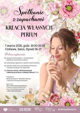 Z okazji Dnia Kobiet zapraszamy na „Spotkanie z zapachami – kreacja własnych perfum”, które odbędzie się 7 marca 2026 r., w godzinach 16:00-19:00 w Kawiarni CieKawa i Salonie (Rynek 26-27).