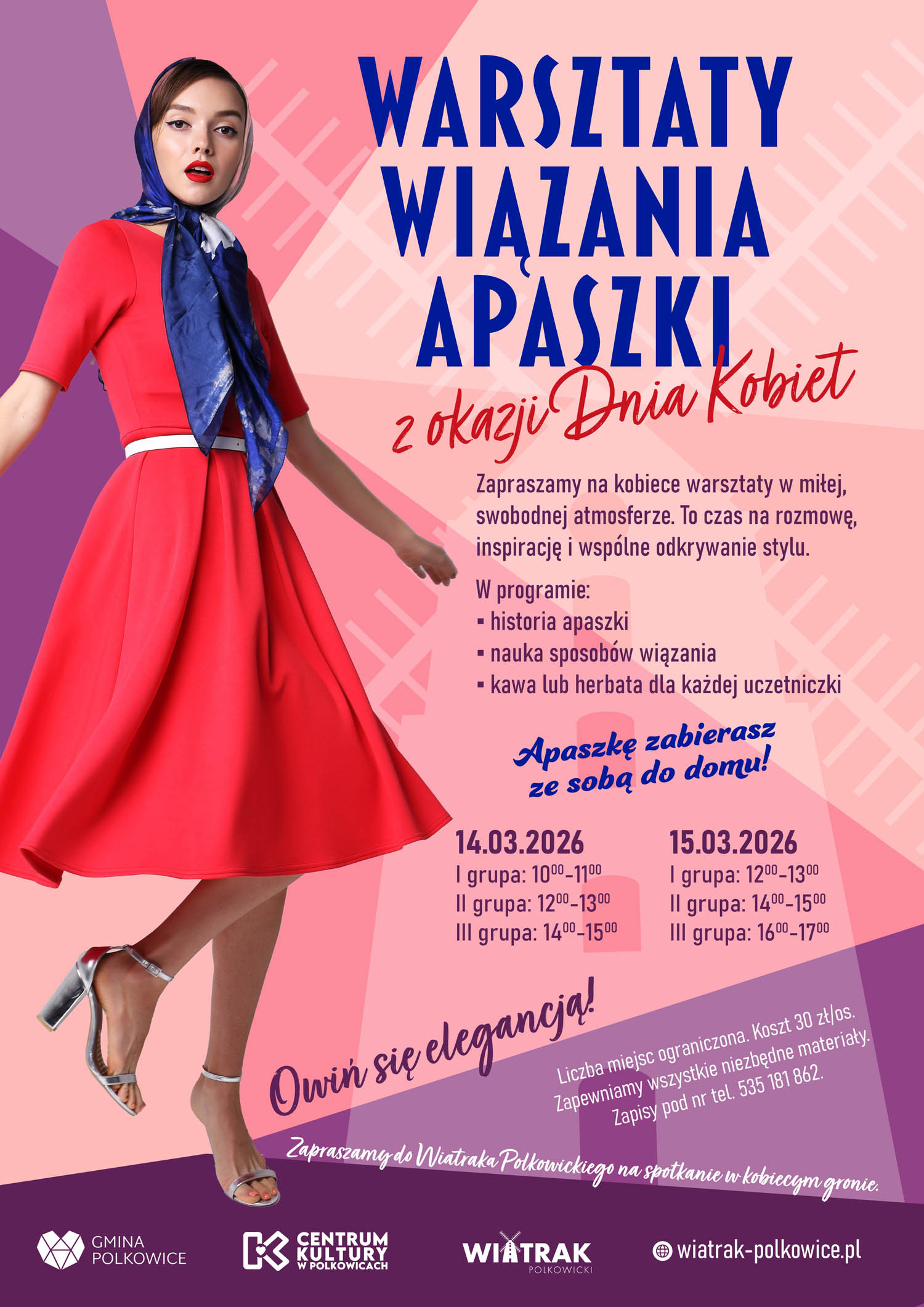 | Miejscowość: Polkowice Miejsce: Wiatrak Polkowicki Data rozpoczęcia: 14.03.2026 10:00:00 Data zakończenia: 15.03.2026 17:00:00 Organizator: Centrum Kultury w Polkowicach Opis wydarzenia: Dzień Kobiet w Wiatraku Polkowickim Owiń się elegancją - warsztaty wiązania apaszki! Są takie dodatki, które potrafią całkowicie odmienić stylizację. Jednym z nich jest apaszka. Niby drobiazg, a robi ogromną różnicę. Z okazji Dnia Kobiet zapraszamy Panie do Wiatraka Polkowickiego na kameralne, stylowe warsztaty poświęcone kobiecym dodatkom i świadomemu budowaniu wizerunku. Co na Was czeka? *krótka historia apaszki, *nauka kilku praktycznych sposobów wiązania, *kawa i herbata dla każdej uczestniczki, *rozmowy, inspiracje i kobieca energia. Każda z uczestniczek otrzyma apaszkę, którą zabierze ze sobą do domu. Terminy spotkań 14 marca 2026 (sobota): 10:00-11:00 12:00-13:00 14:00-15:00 15 marca 2026 (niedziela): 12:00-13:00 14:00-15:00 16:00-17:00 Koszt udziału: 30 zł / os. Zapewniamy wszystkie niezbędne materiały. Zapisy pod numerem telefonu: 535 181 862 Liczba miejsc ograniczona. Każda grupa liczy maksymalnie 8 osób – zależy nam na kameralnej atmosferze. Jeśli masz ochotę spędzić Dzień Kobiet w eleganckiej, inspirującej atmosferze i nauczyć się czegoś praktycznego - zapraszamy do Wiatraka Polkowickiego. |