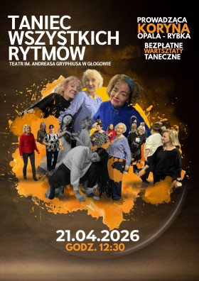Zapraszamy na warsztaty „Taniec wszystkich rytmów”, które odbędzie się 21.04.2026r w Teatrze im. Andreasa Gryphiusa w Głogowie. Pod okiem Koryny Opali-Rybki odkryjesz radość tańca w różnorodnych rytmach, niezależnie od poziomu zaawansowania. To świetna okazja, by poczuć swobodę ruchu, spotkać ciekawych ludzi i spędzić dzień w pozytywnej atmosferze. Przyjdź, zatańcz i pozwól porwać się muzyce!