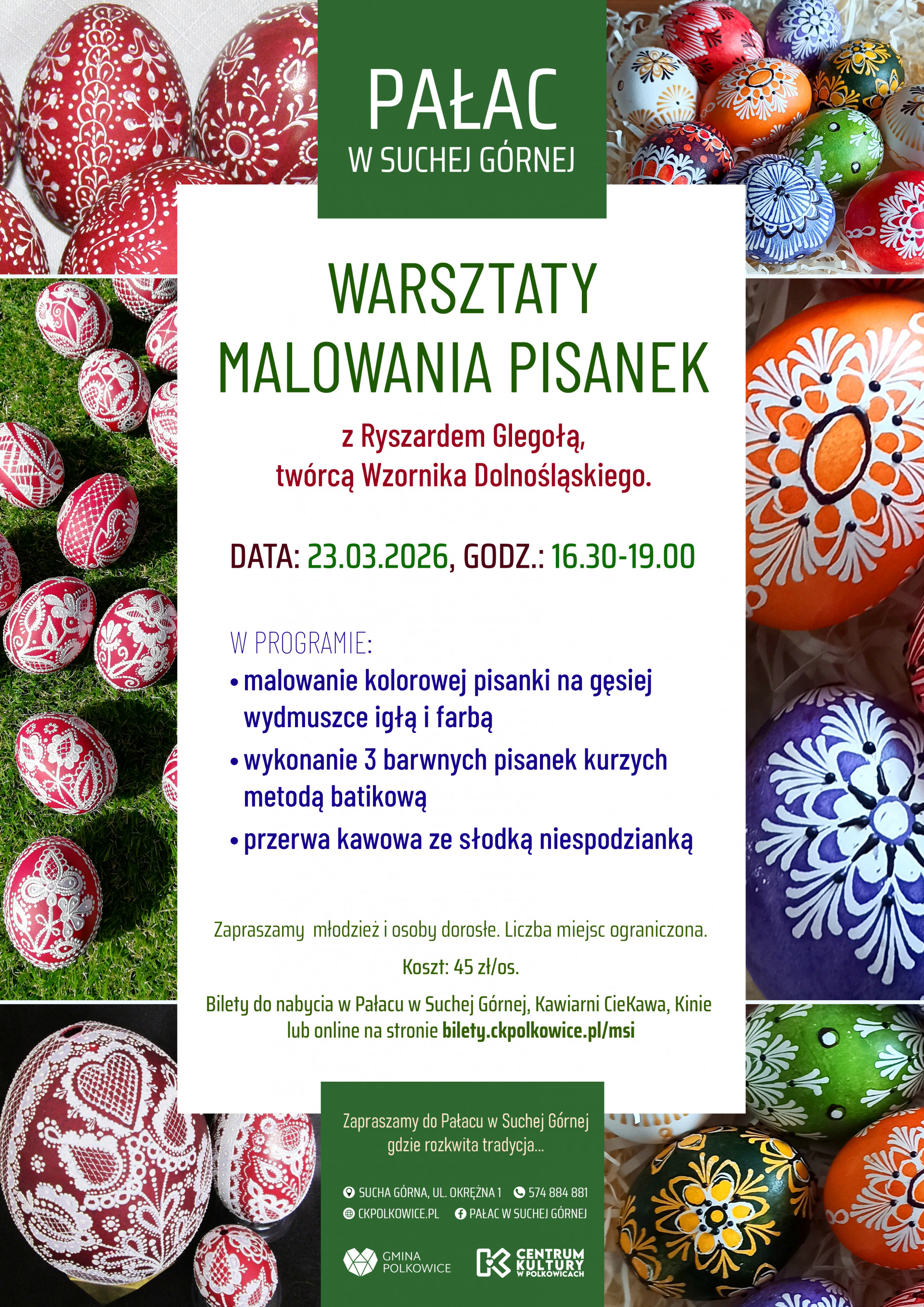 Warsztaty odbędą się 23 marca w godzinach 16.30-19.00 w Pałacu w Suchej Górnej. W programie przewidziano również przerwę kawową ze słodką niespodzianką. Zajęcia skierowane są do młodzieży i dorosłych. Zapewniamy wszystkie potrzebne materiały.