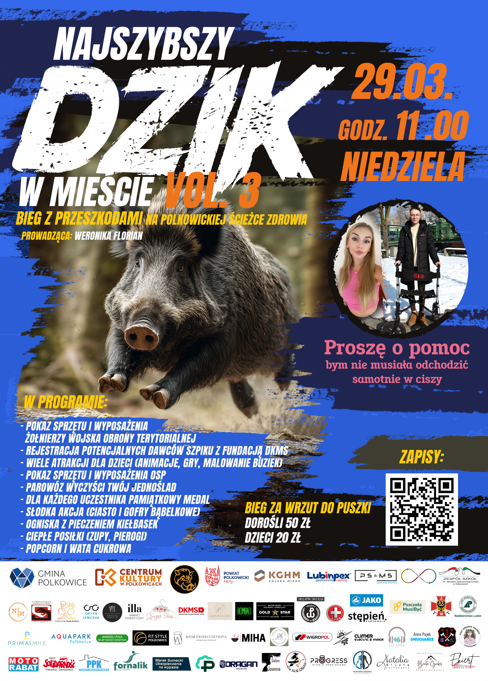 | Miejscowość: Polkowice Miejsce: Ścieżka Zdrowia w Polkowicach Data rozpoczęcia: 29.03.2026 11:00:00 Data zakończenia: 29.03.2026 14:00:00 Organizator: Centrum Kultury w Polkowicach, Polkowickie Centrum Wolontariatu, Weronika Florian i przyjaciele Opis wydarzenia: Zapraszamy w niedzielę, 29 marca o godz. 11:00 na Polkowicką Ścieżkę Zdrowia gdzie odbędzie się wyjątkowe wydarzenie sportowo-charytatywne – „Najszybszy Dzik w Mieście vol. 3”. To bieg z przeszkodami, który łączy aktywność fizyczną, dobrą zabawę i pomoc potrzebującym. W programie m.in.: - bieg z przeszkodami - TOR PRZESZKÓD dla dzieci - atrakcje dla dzieci - pokazy sprzętu i wyposażenia żołnierzy Wojska Obrony Terutorialnej - pokaz sprzętu i wyposażenia Ochotniczej Straży Pożarnej - czyszczenie parowe jednośladów - słodka akcja, ciasta - ogniska z pieczeniem kiełbasek - gofry, wata cukrowa, popcorn - pierogi, zupa To nie tylko sportowa rywalizacja, ale przede wszystkim wydarzenie z sercem – uczestnicy pobiegną również, by wesprzeć ważny cel. Wpisowe za wrzut do puszki: • dorośli – 50 zł • dzieci – 20 zł Zapisy dostępne przez kod QR na plakacie. Zapraszamy wszystkich chętnych do wspólnej zabawy i pomagania! Przyjdź, pobiegnij, kibicuj – i pokaż, że razem możemy więcej! |