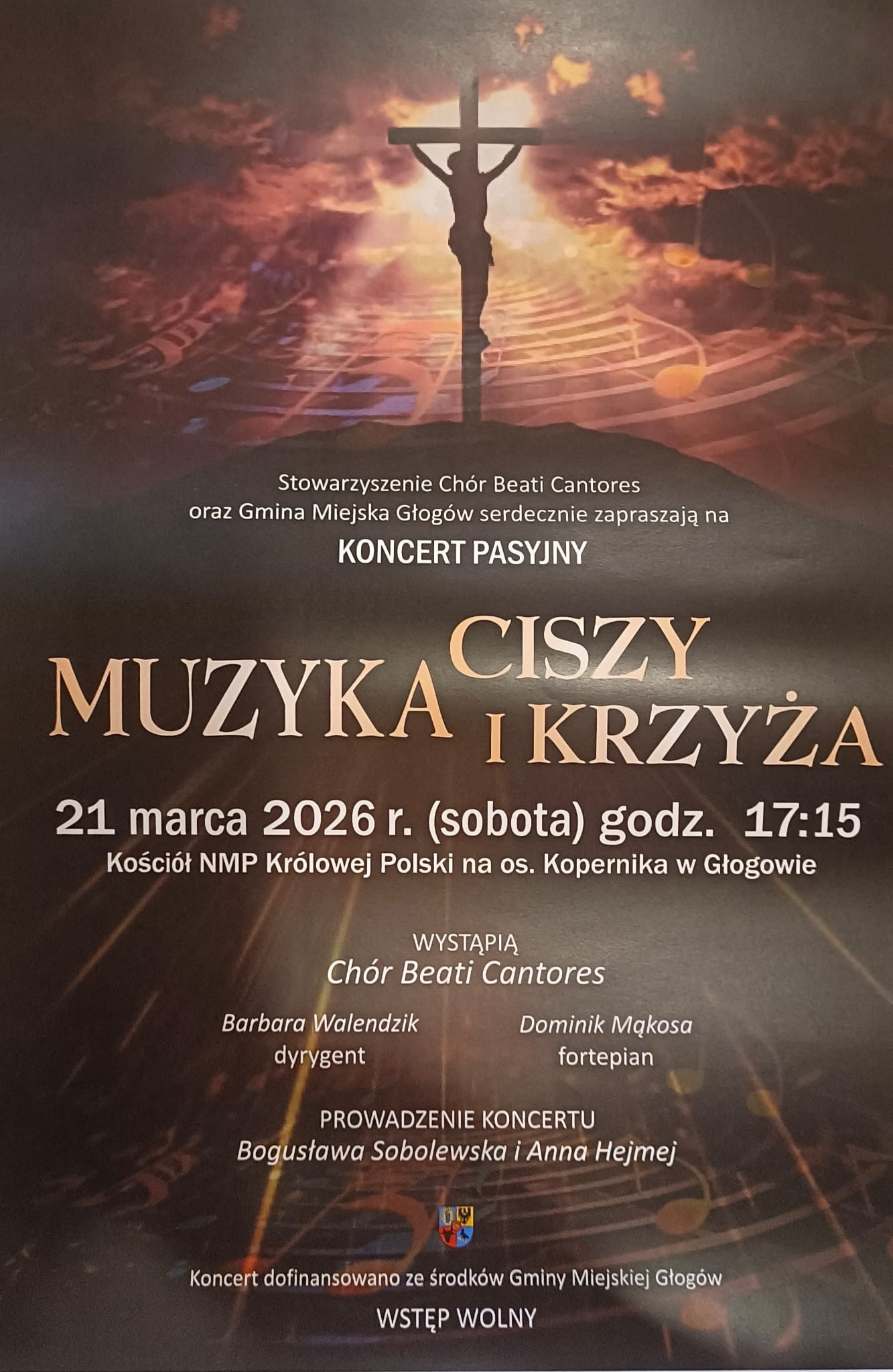 Stowarzyszenie Chór Beati Cantores zaprasza na koncert pasyjny pt. „Muzyka ciszy i krzyża” w wykonaniu chóru pod dyrekcją Barbary Walendzik oraz pianisty Dominika Mąkosy. Podczas tego wyjątkowego koncertu zaprezentujemy dzieła europejskiej muzyki sakralnej, którym towarzyszyć będzie słowo zaczerpnięte z tradycyjnych tekstów łacińskich i ewangelii, opisujące tajemnicę męki i odkupienia.