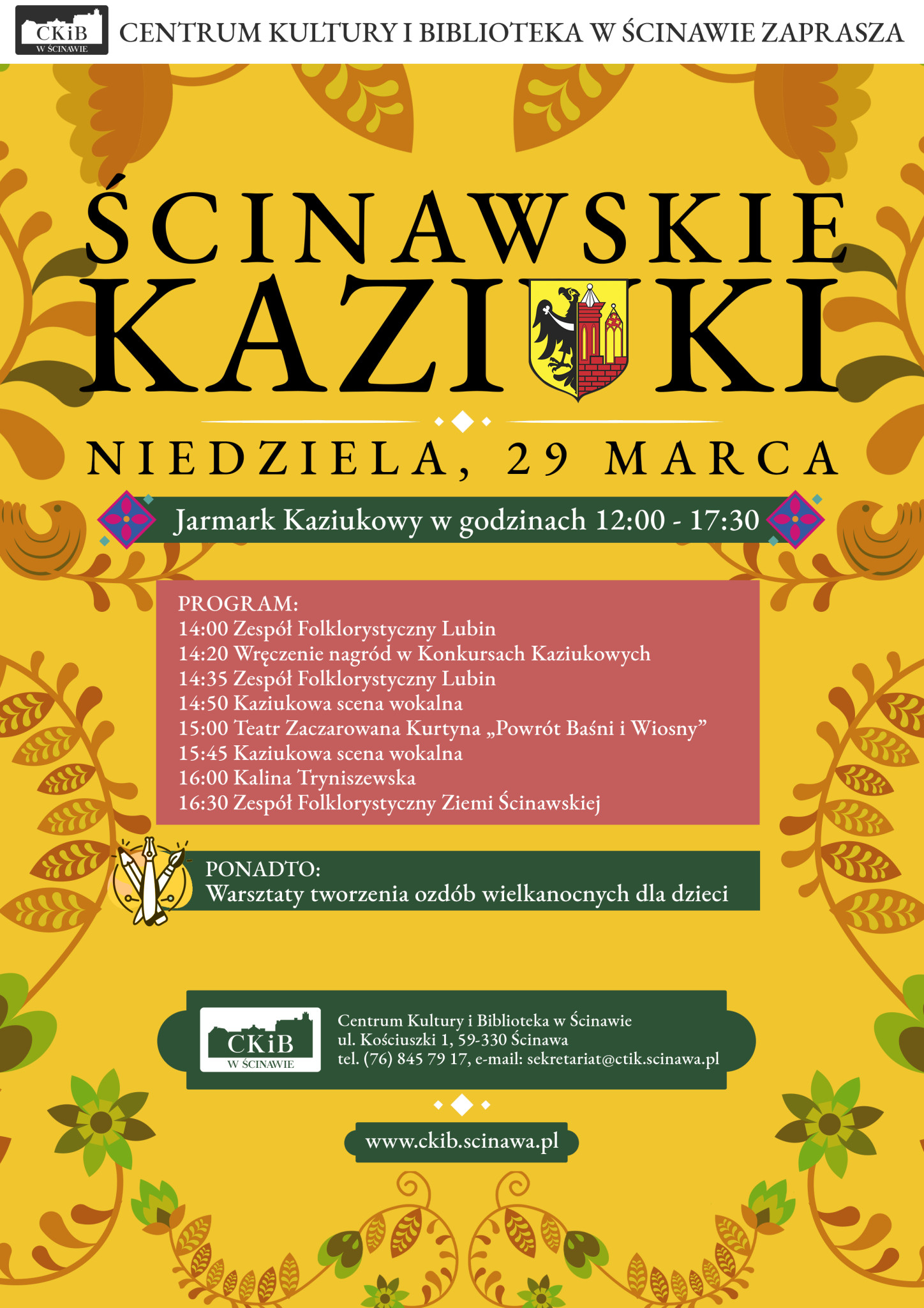 Centrum Kultury i Biblioteka w Ścinawie serdecznie zaprasza mieszkańców oraz gości na wyjątkowe wydarzenie – Ścinawskie Kaziuki, które odbędą się w niedzielę, 29 marca. Tego dnia w Ścinawie będzie można poczuć prawdziwą atmosferę wiosennego jarmarku inspirowanego tradycją wileńskich Kaziuków. W godzinach 12:00–17:30 na uczestników czekać będzie Jarmark Kaziukowy, podczas którego nie zabraknie regionalnych produktów, rękodzieła oraz wyjątkowej, rodzinnej atmosfery. To doskonała okazja, aby spędzić niedzielne popołudnie wśród tradycji, muzyki i lokalnej kultury.