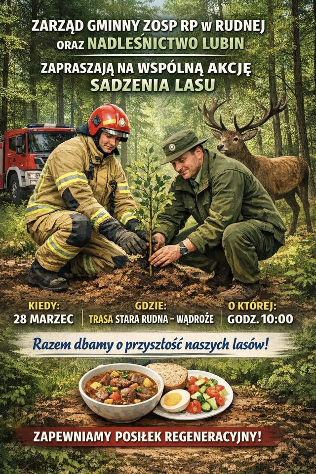 Zarząd Gminny ZOSP RP w Rudnej oraz Nadleśnictwo Lubin zapraszają wszystkich chętnych na wspólną akcję sadzenia lasu.