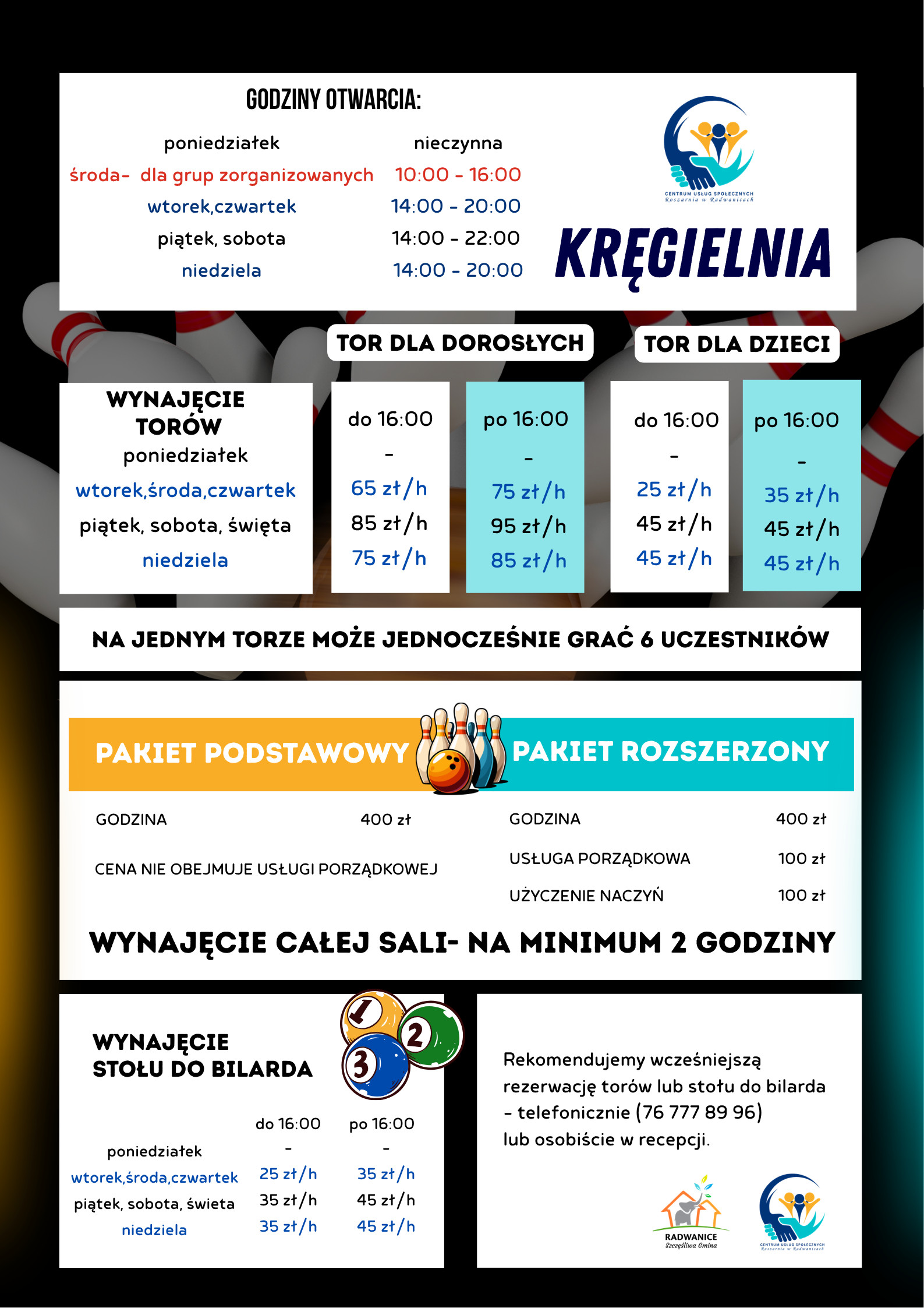 | Miejscowość: Radwanice Miejsce: Radwanice Data rozpoczęcia: 01.04.2026 10:00:00 Data zakończenia: 30.04.2026 20:00:00 Organizator: CUS Roszarnia w Radwanicach Opis wydarzenia: Mamy świetną wiadomość dla wszystkich miłośników kręgli – od środy 11 marca 2026 roku rusza kręgielnia w CUS Roszarnia w Radwanicach! Środy są dedykowane dla grup zorganizowanych, dlatego obowiązują w tym dniu specjalne godziny otwarcia: 10:00–16:00 To świetna okazja na wspólną zabawę, integrację i trochę sportowej rywalizacji! Zbierz swoją grupę i wpadnijcie sprawdzić tor. Standardowe godziny otwarcia kręgielni: poniedziałek – nieczynna środa – 10:00-16:00 wtorek, czwartek – 14:00–20:00 piątek, sobota – 14:00–22:00 niedziela – 14:00–20:00 Zachęcamy do wcześniejszej rezerwacji torów lub stołu do bilarda: 76 777 89 96 lub bezpośrednio w recepcji. Do zobaczenia na torach! |